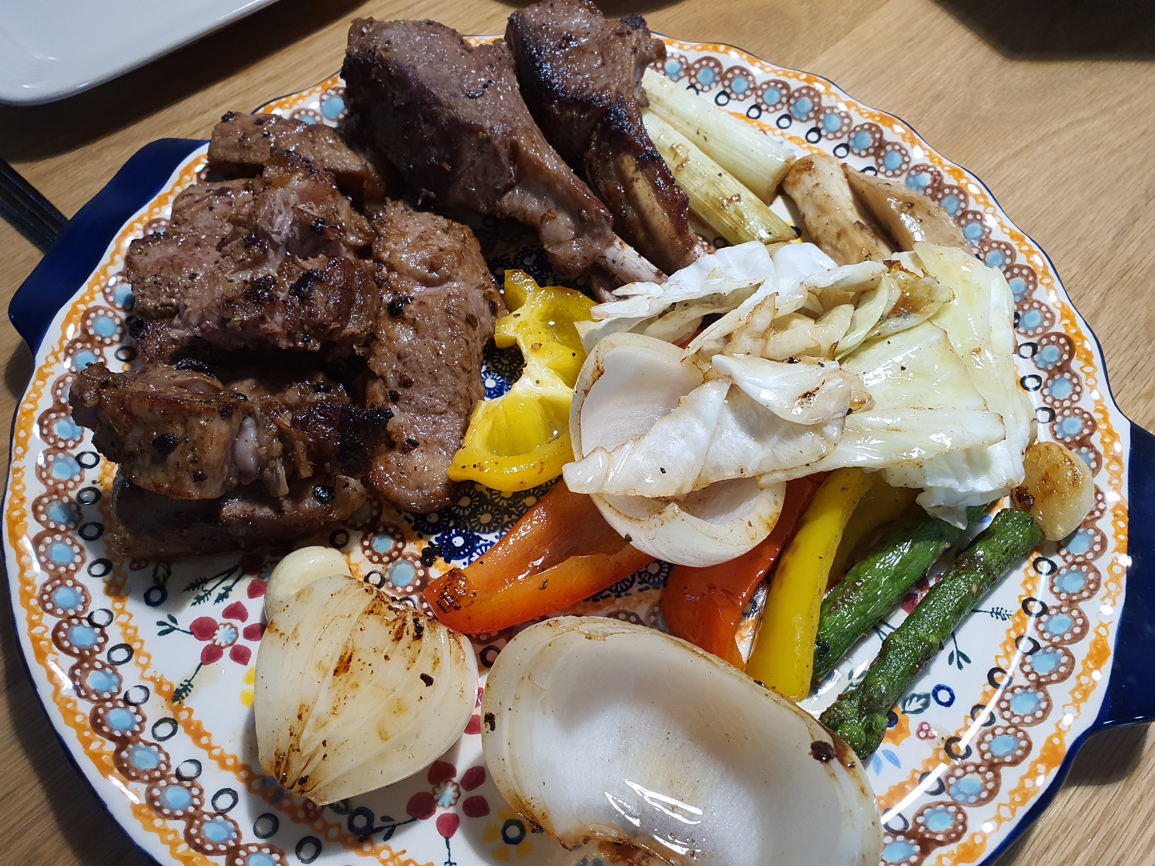 드디어 메인 디쉬가 완성되었습니다! 스테이크는 뼈가 너무 커서, 살코기만 잘라서 접시에 올려두었습니다. 사진으로 볼 때는 양이 적어 보이지만, 이 접시가 지름 30cm 정도로 사이즈가 굉장히 큽니다. 둘이서 아주 배부르게 먹었답니다.