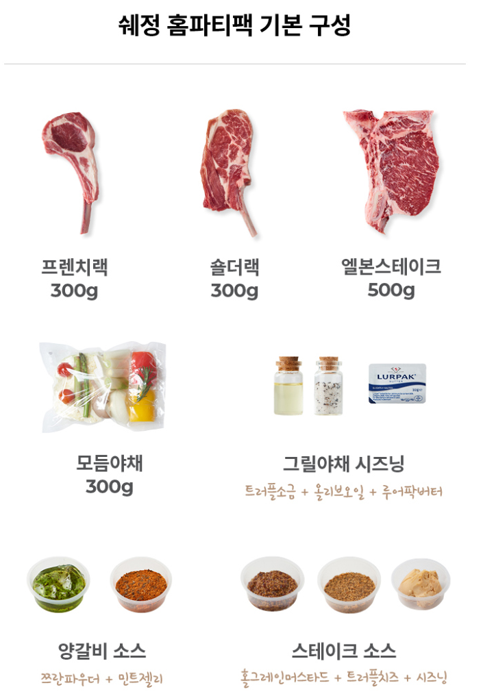 별다른 준비물이 필요 없을 정도로 고기, 야채, 시즈닝, 소스가 잘 갖춰져 있습니다. 홈파티팩에 김치와 밥만 챙겨서 바로 캠핑하러 가도 될 것 같아요!