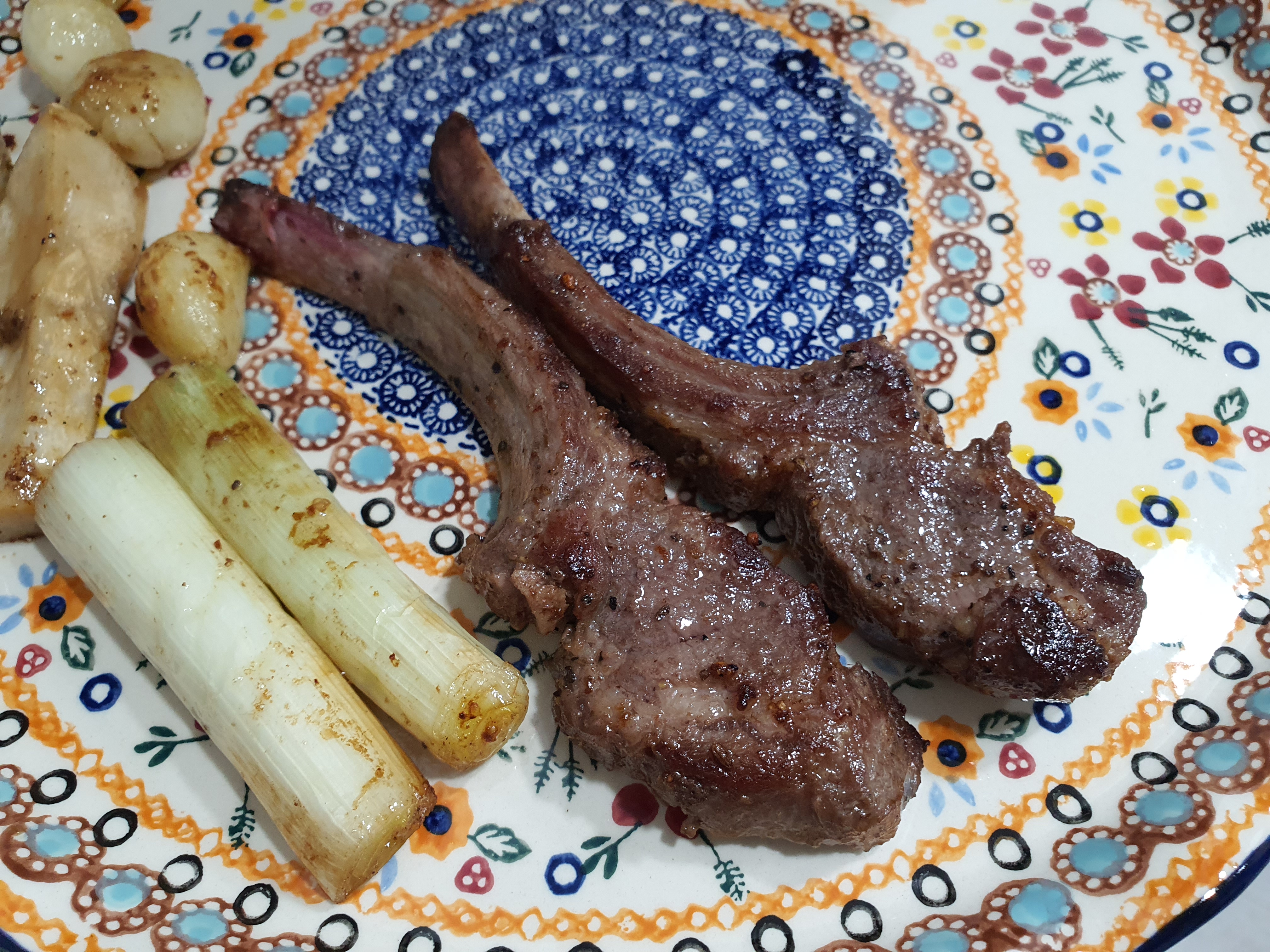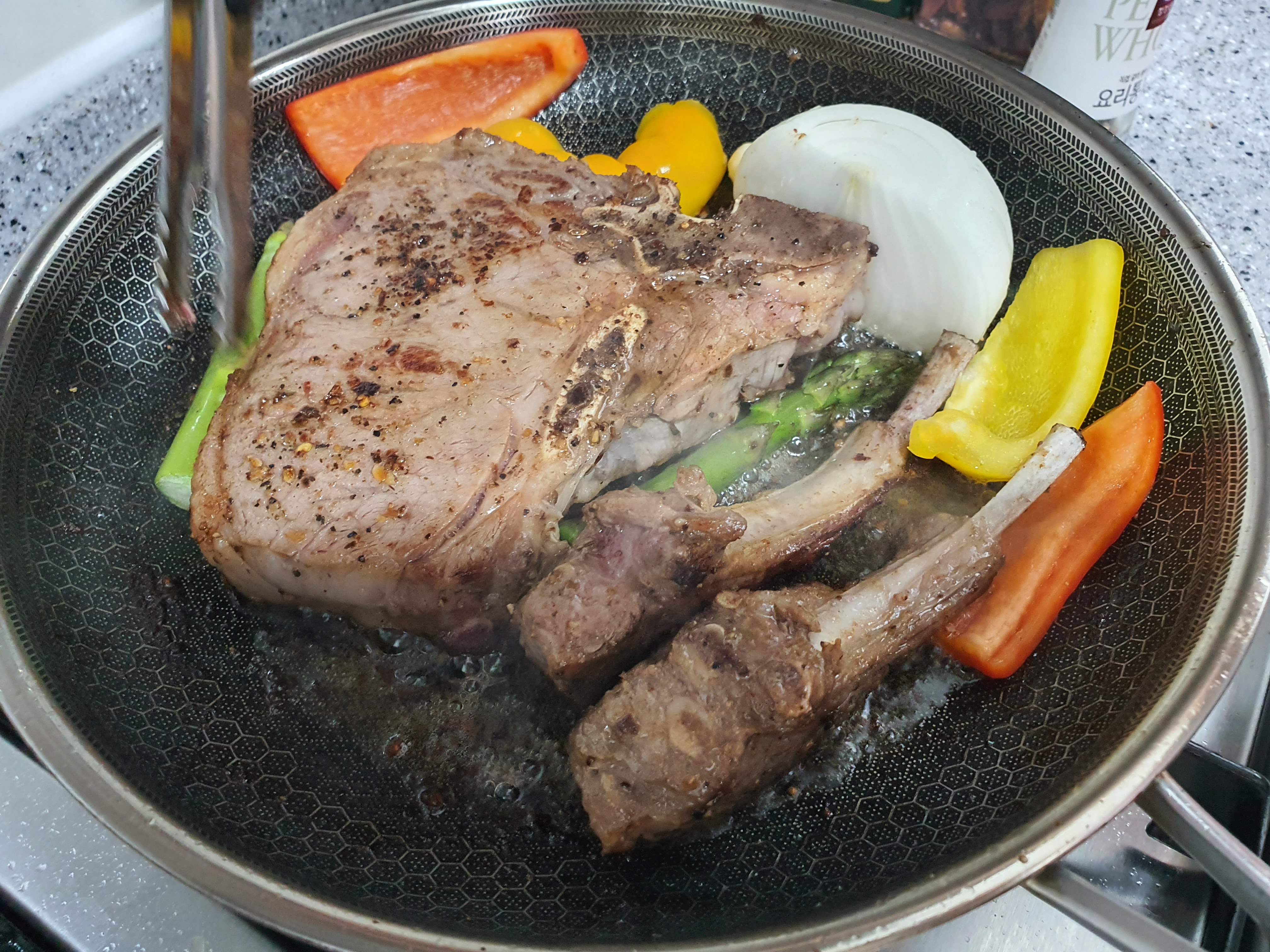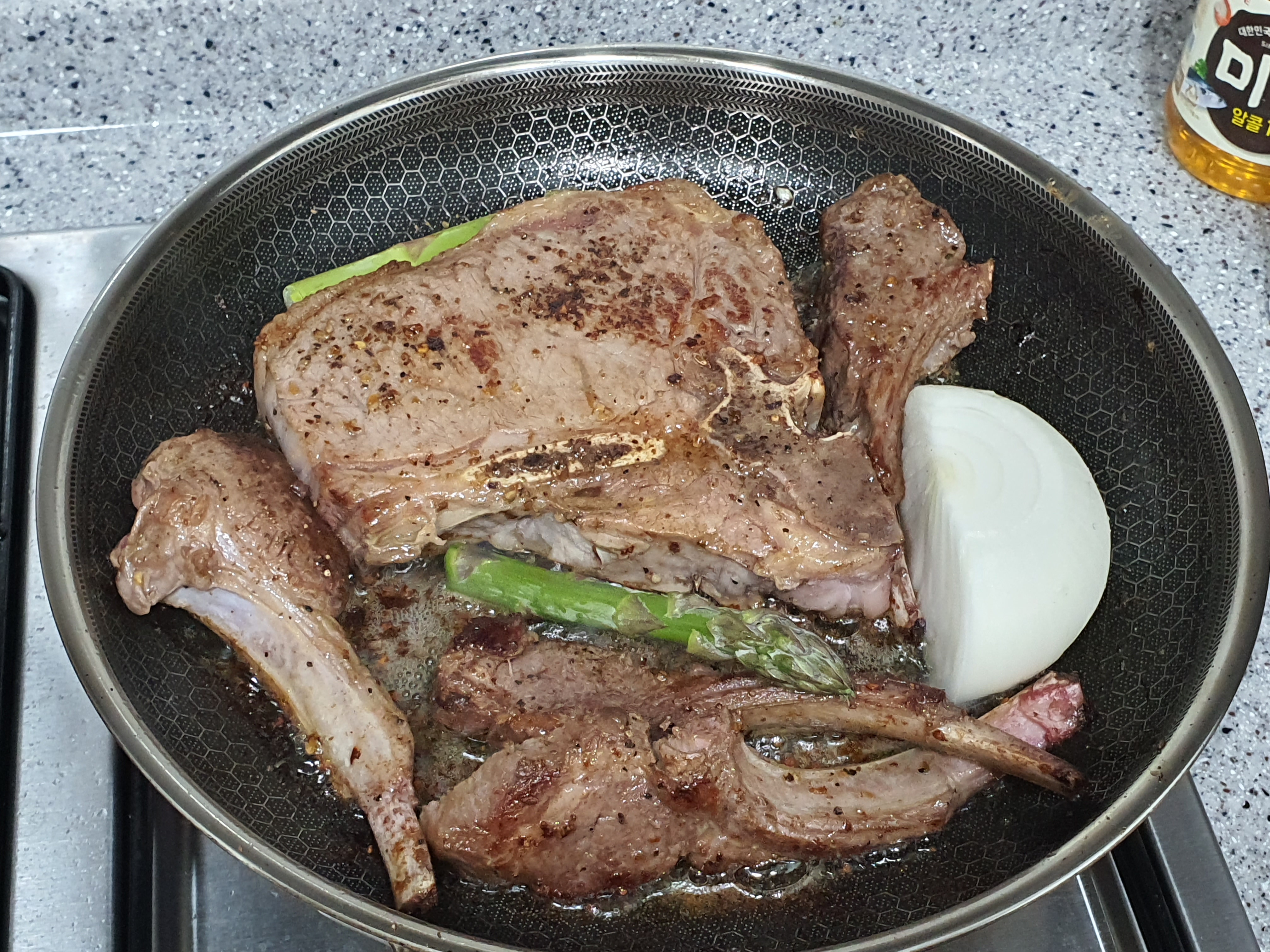 엘본 스테이크가 워낙 두꺼워서 오래 걸리더라고요. 엘본스테이크를 먼저 굽고 나중에 프렌치랙을 구웠어야 하는데... 프렌치랙은 가지런히 접시에 올려두고, 엘본스테이크는 계속해서 구웠습니다.