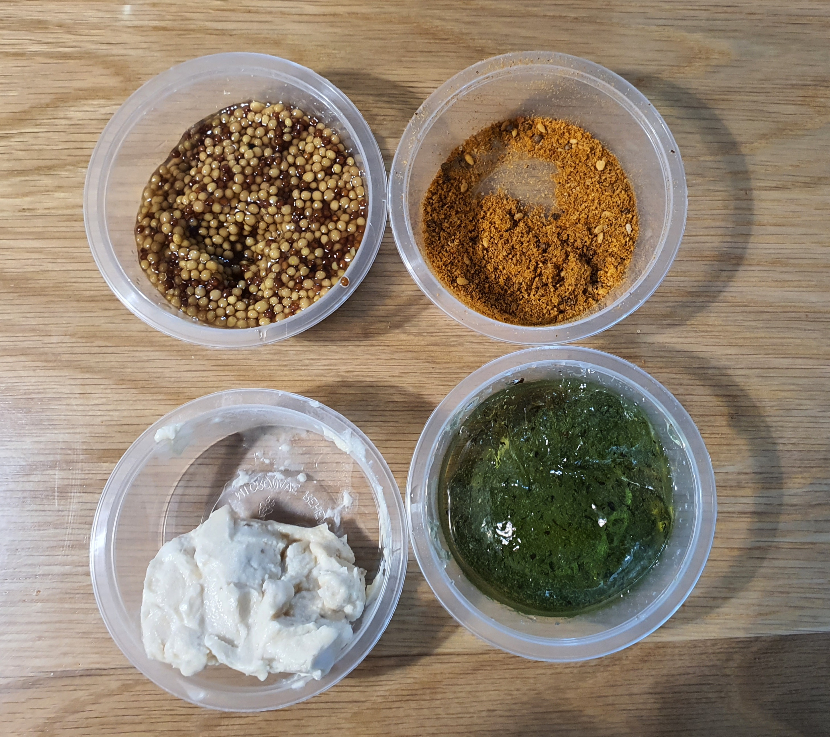 소스도 전부 다(민트젤리 빼고) 만족스러웠어요! 남편은 트러플 치즈를 제일 좋아했어요. 치즈 맛이 굉장히 진한데요, 끝 맛이 조금 특이하고 살짝 느끼하긴 합니다. 홀그레인 머스터드 소스는 겨자씨 알갱이가 오통통해서 씹히는 식감이 매력적이었어요.