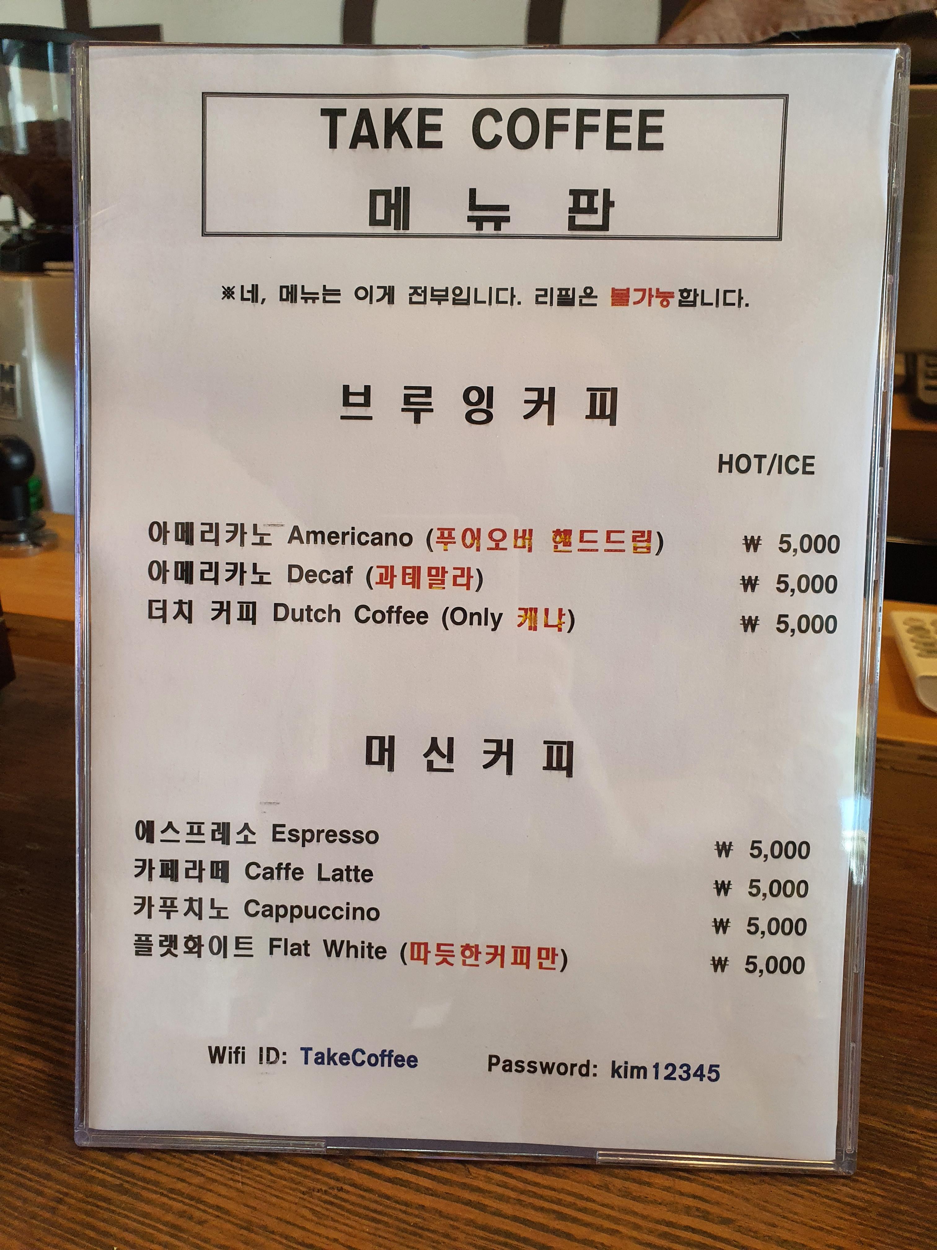 테이크커피에서 판매 중인 메뉴는 정말 심플해요. 오직 커피만 팝니다. 딱 7개-아메리카노, 아메리카노 디카페인, 더치커피, 에스프레소, 카페라떼, 카푸치노, 플랫화이트-가 전부입니다. 가격도 전부 5,000원으로 동일합니다.
