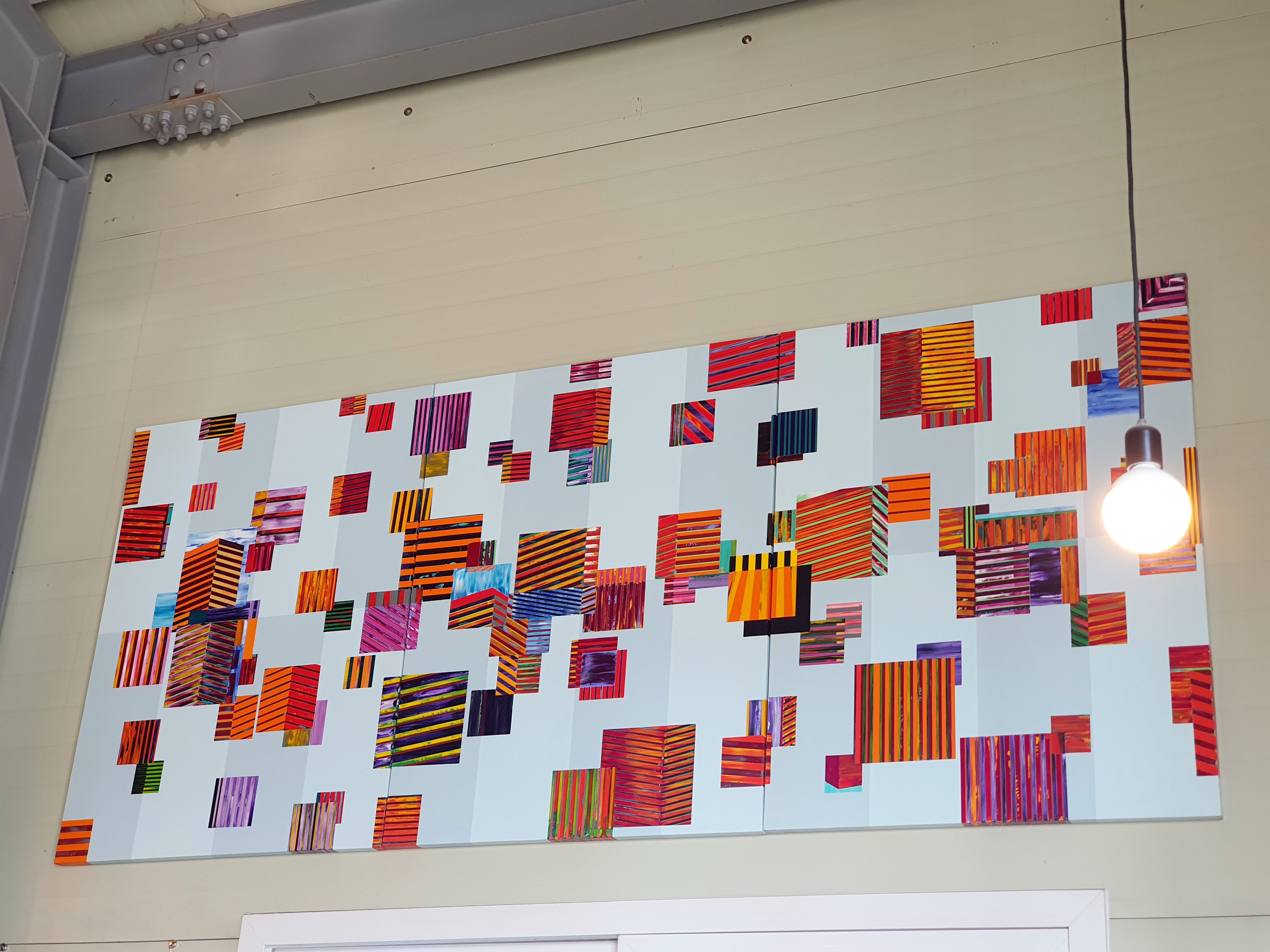 가구나 장식은 빈티지하지만, 벽면에 달려있는 대형 그림은 뭔가 트렌디해 보였어요. 추상화된 비디오 아트 같기도 하면서 현대미술 느낌이 뿜뿜합니다. 심심한 아이보리색 벽면에 활기를 불어 넣어주는 작품이었어요.