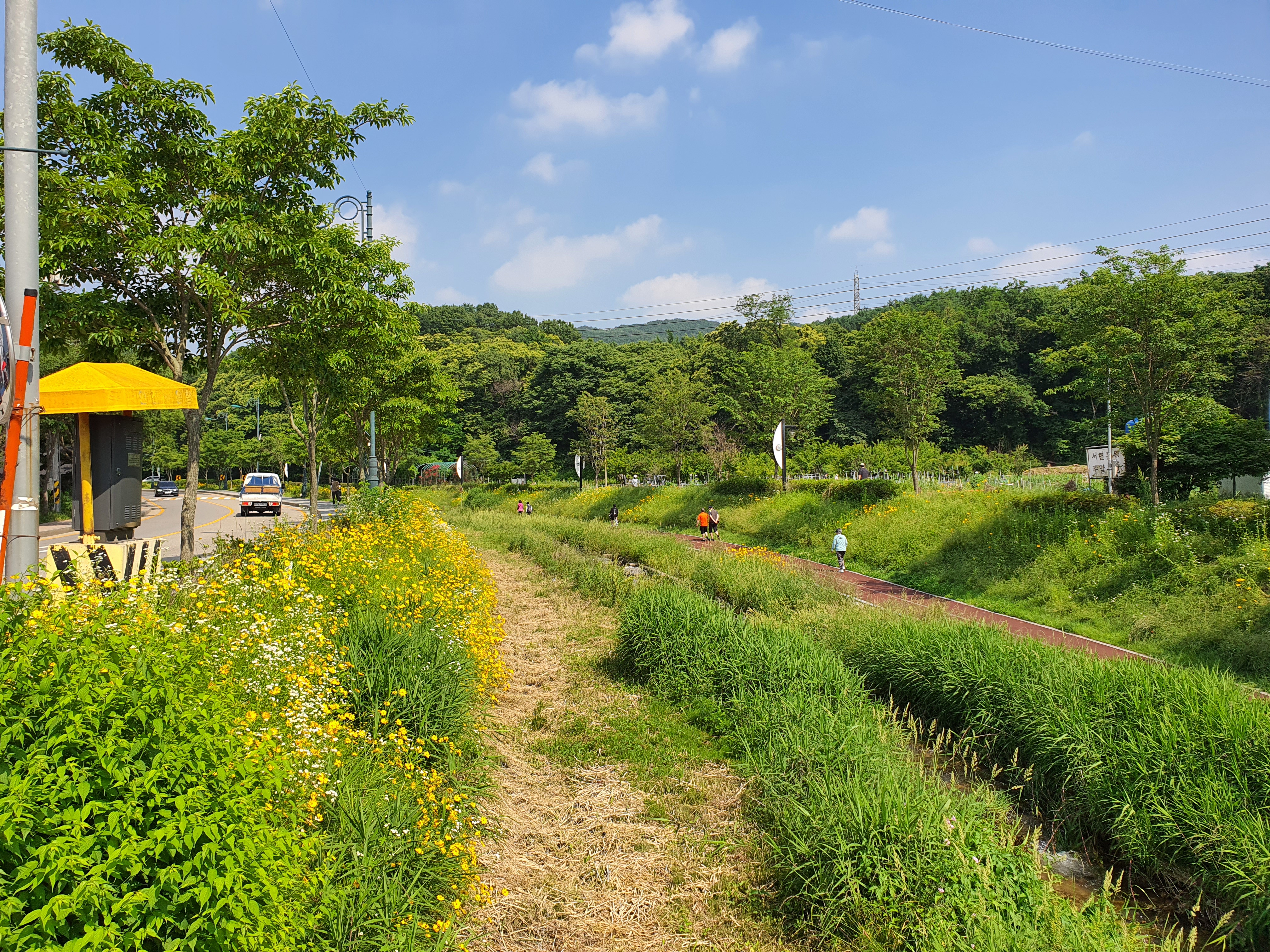 길을 따라 왕림천이 이어져 있습니다. 좀 더 위쪽은 계곡같기도 해요. 약간 정비된 느낌이랄까요? 아이들이 물에서 재미나게 놀고 있었어요. 백운산에서 내려온 계곡물이라 깨끗할 것 같습니다. 다만 주변에 주말농장이나 밭이 있어서 마셔도 될 정도로 깨끗할 것 같지는 않아요. 분수대 물 정도 되지 않을까... 추측해봅니다.