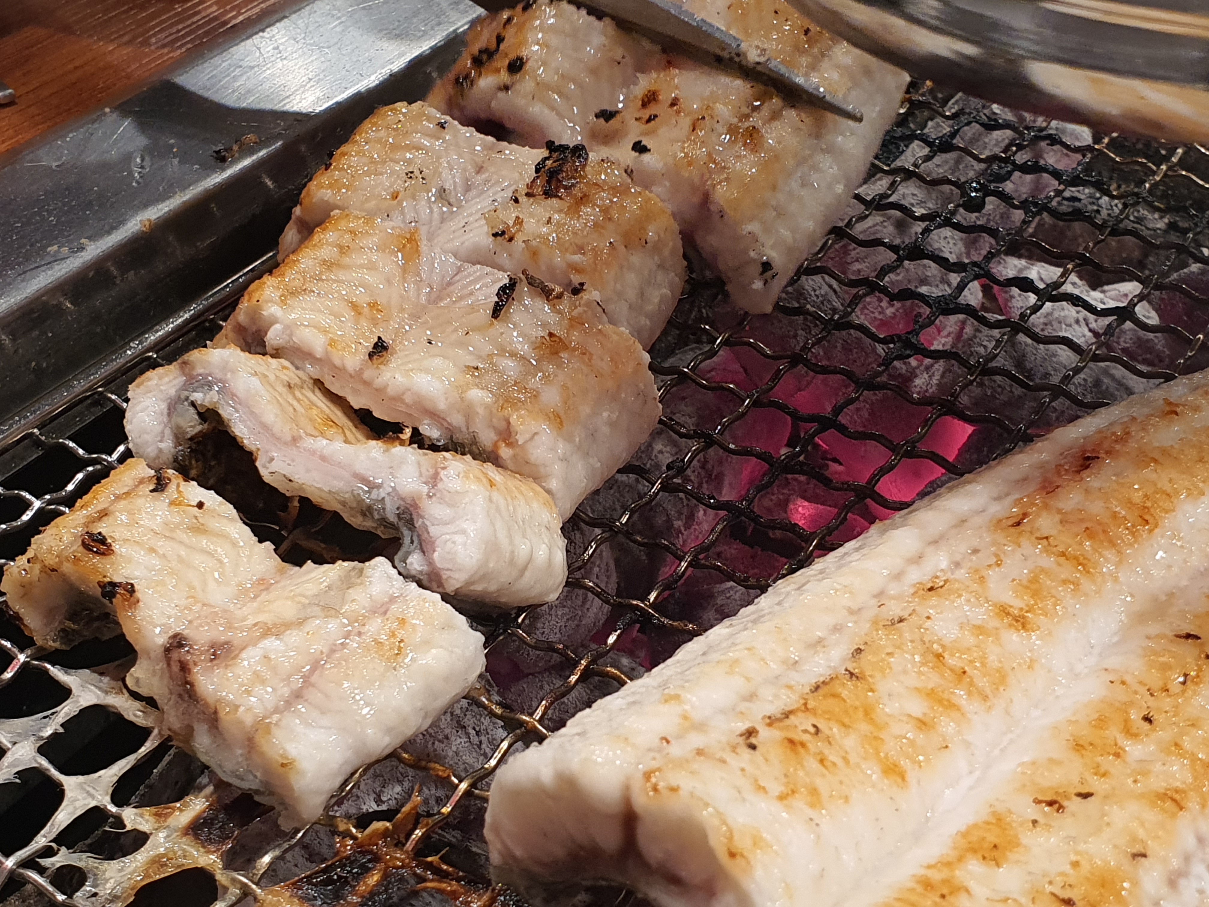장어가 숯불에 열심히 구웠습니다. 껍질은 잘 타기 때문에 배쪽 위주로 잘 익혀주었어요.