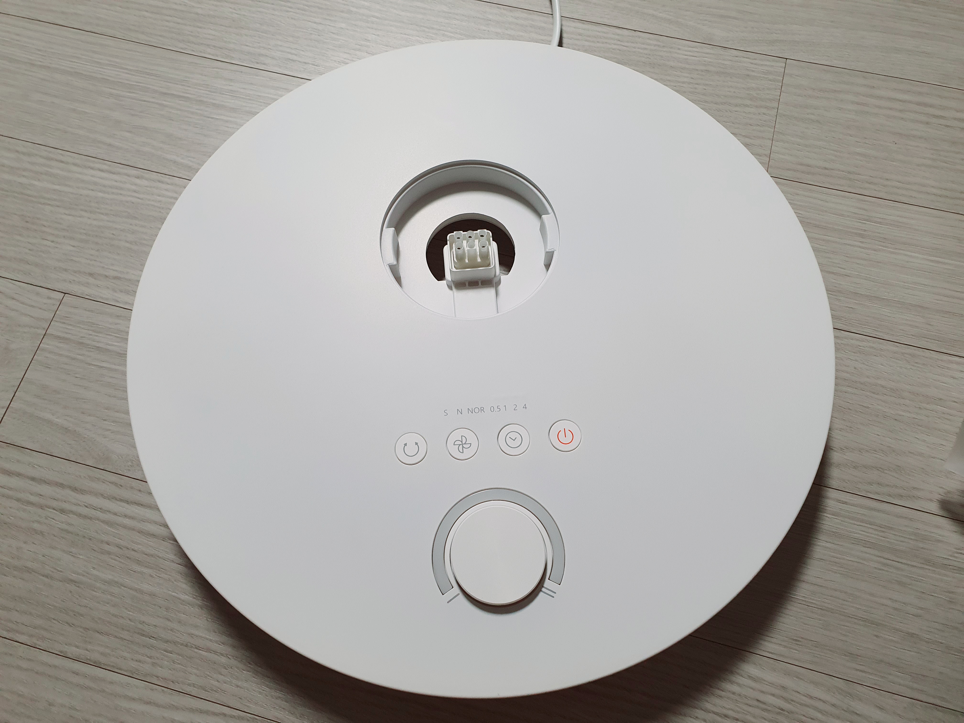 본체 윗면은 버튼 4개 + 바람세기 조절용 휠로 심플하게 구성되어 있습니다. 뒷부분에서 간단히 버튼별 동작을 설명할 예정입니다.