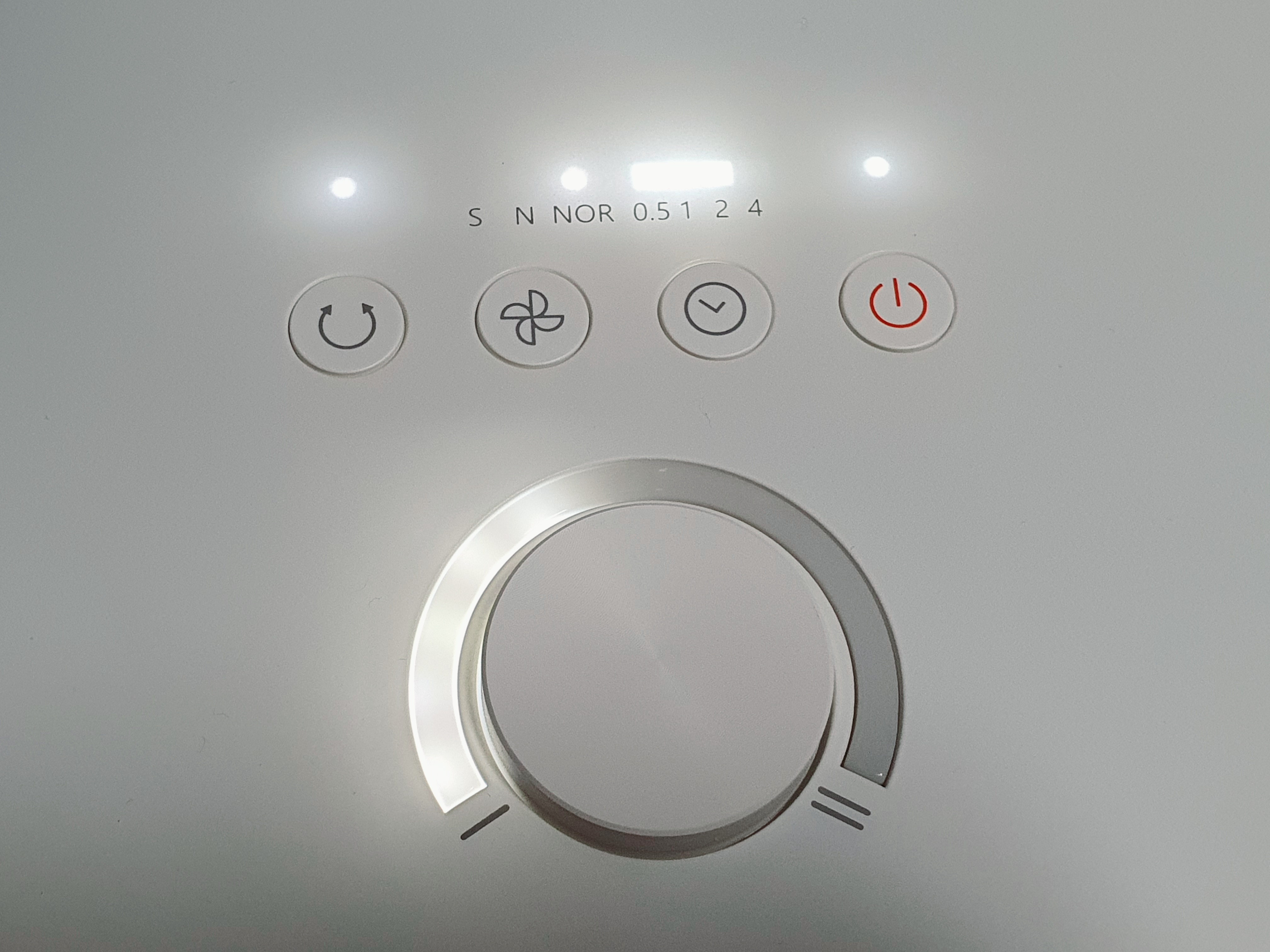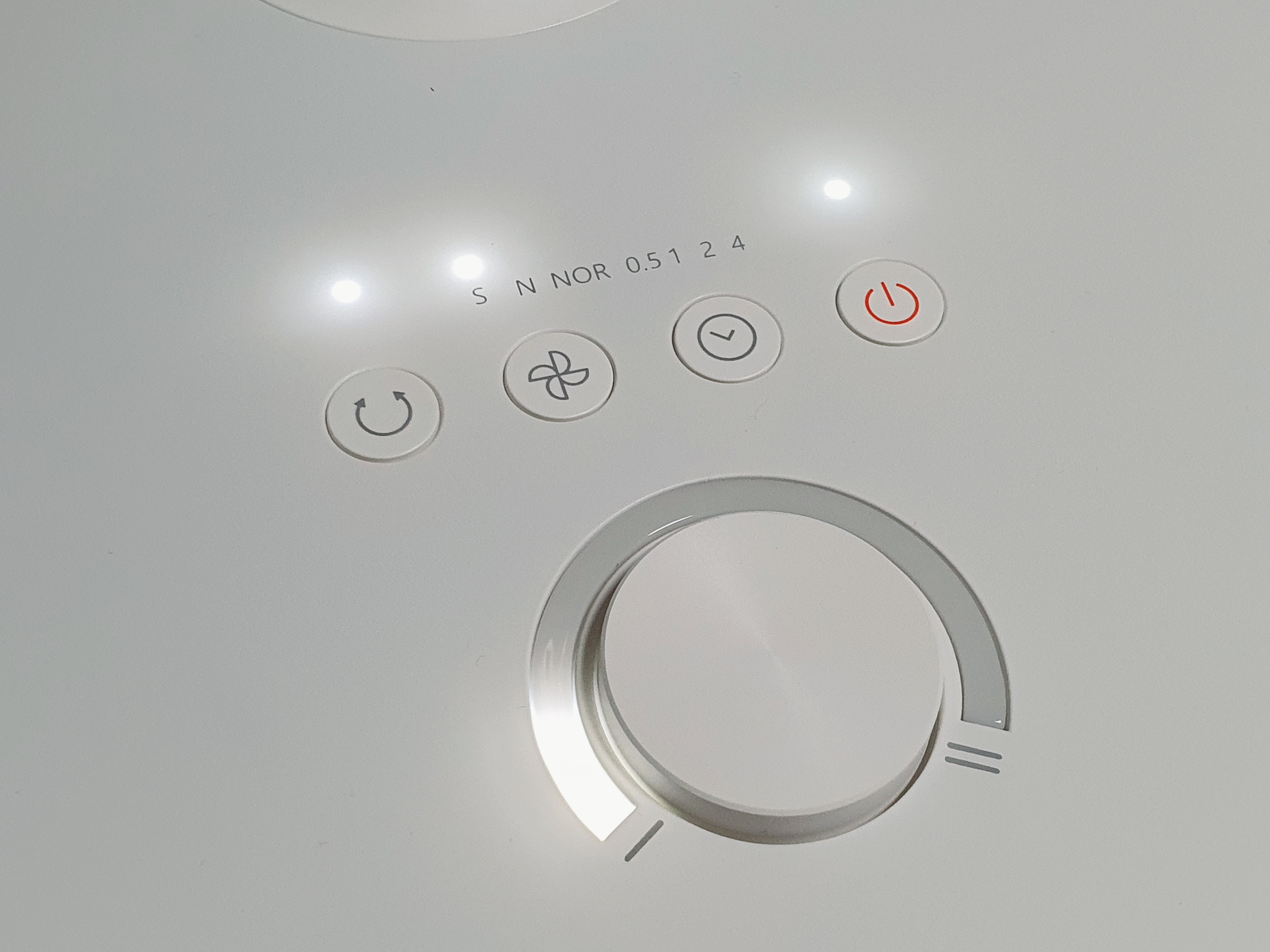 UI가 꽤 직관적으로 되어 있습니다. 휠은 바람세기를 조절하는 데 사용됩니다. 첫 번째 버튼은 회전, 두 번째 버튼은 수면풍-자연풍-일반모드 설정, 세 번째 버튼은 시간 설정, 마지막 버튼은 종료버튼입니다.