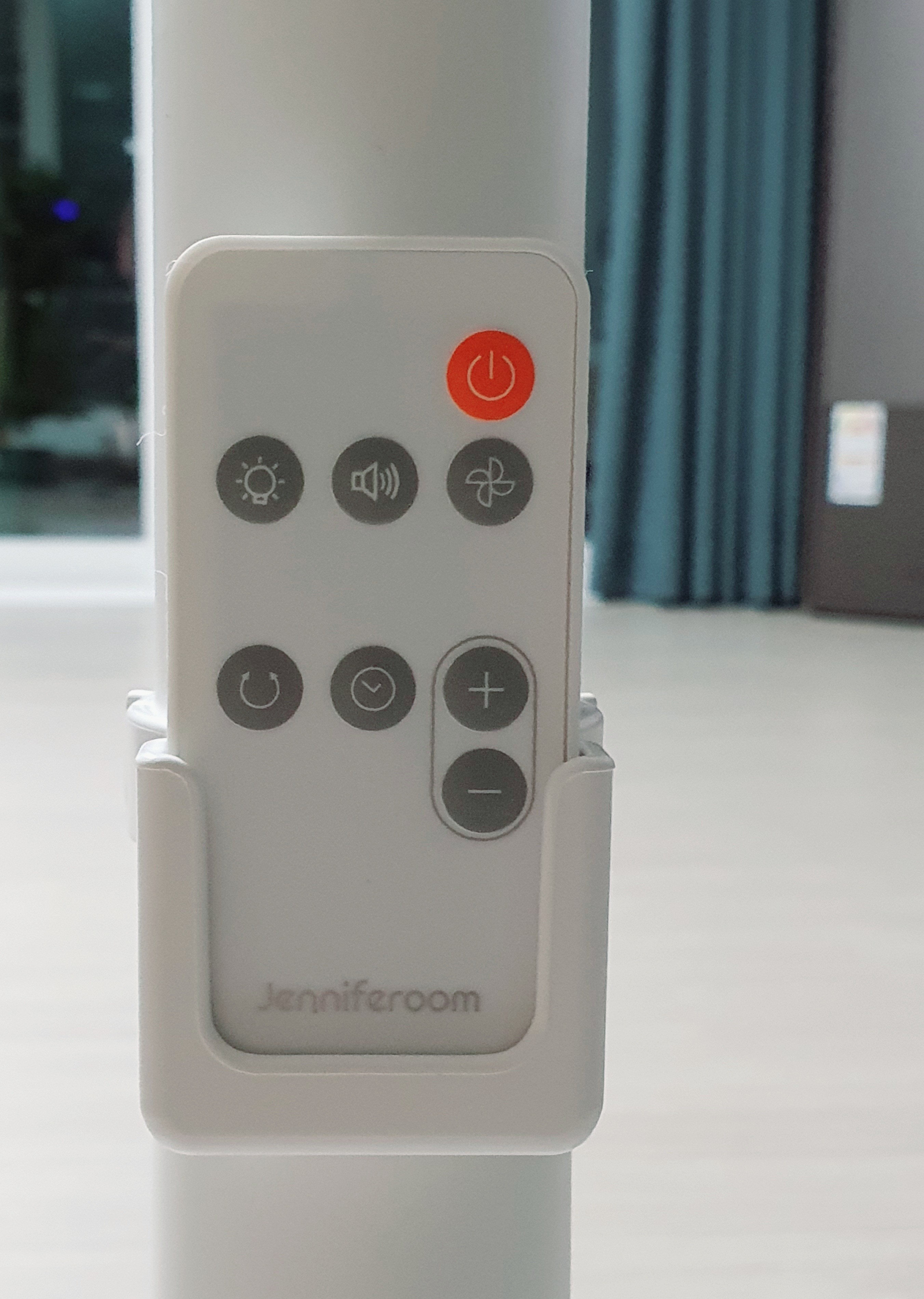선풍기 기둥에 리모컨을 거치할 수 있습니다. IR 수신기가 바닥에 있어서 바닥을 향해 리모콘을 사용해 주는 것이 좋습니다. 선풍기 헤드에 대고 누르면 가끔 동작을 안 하더라고요.