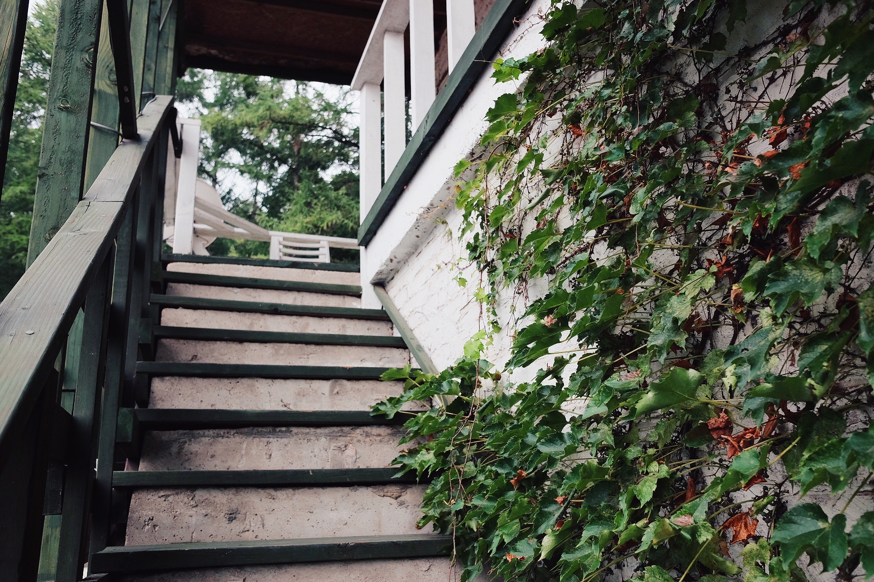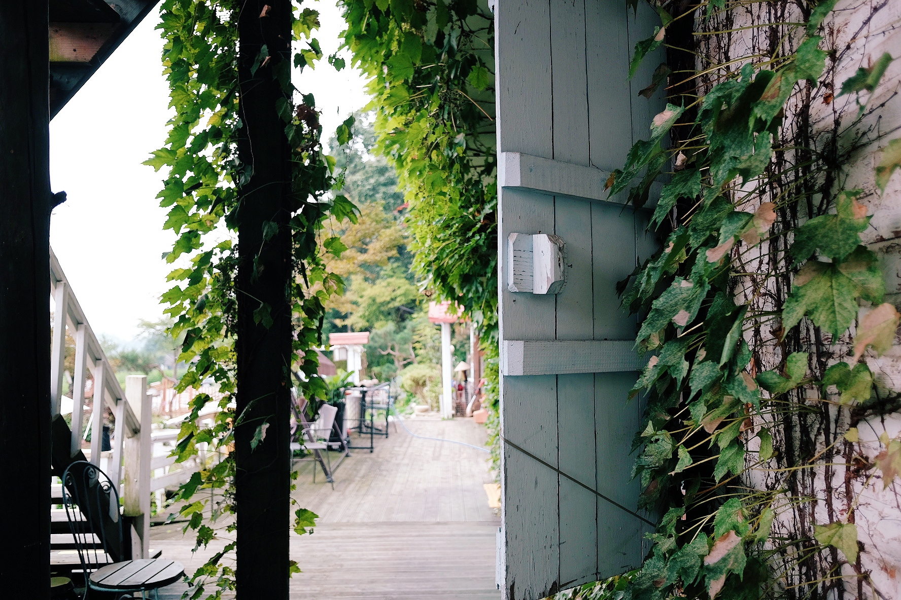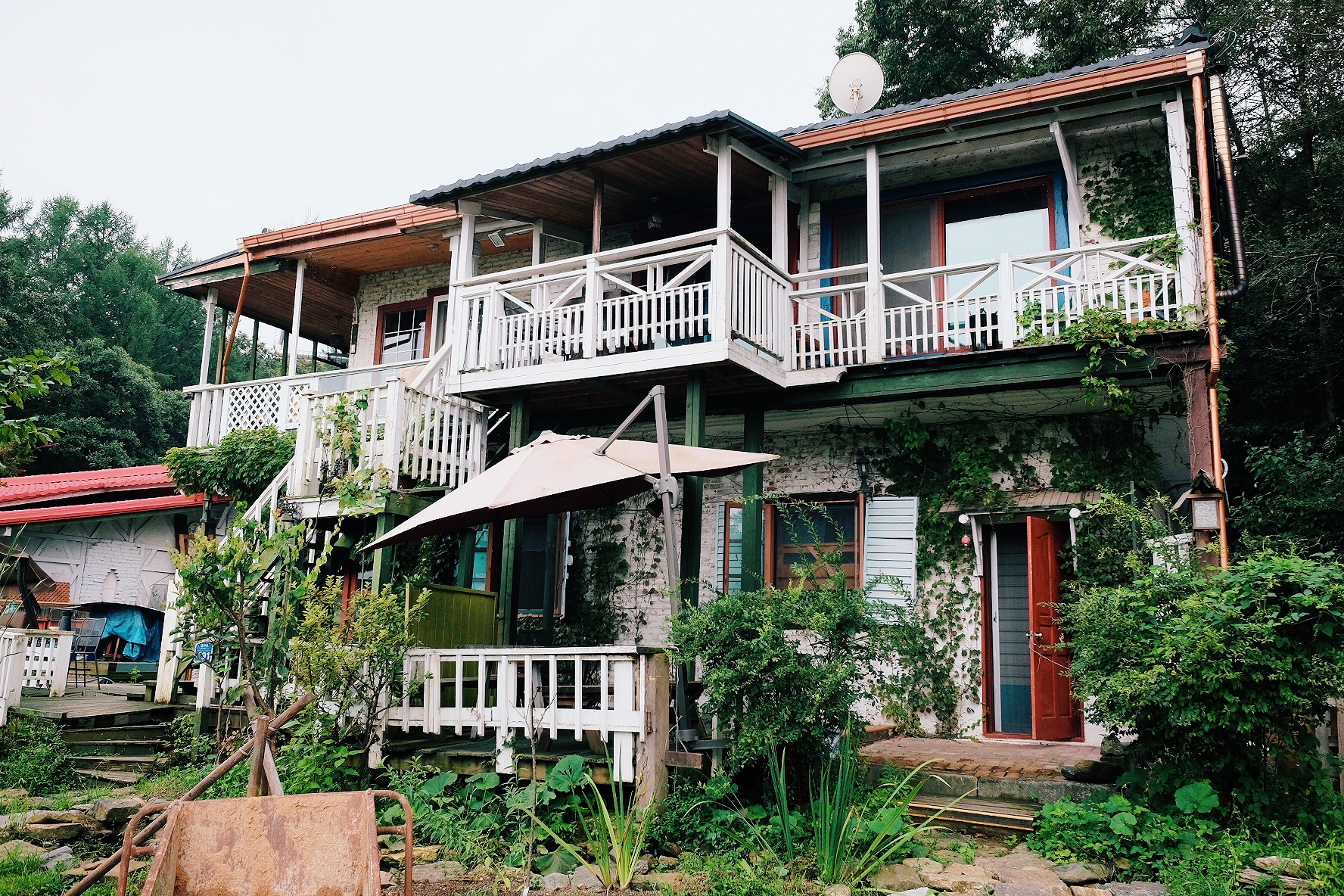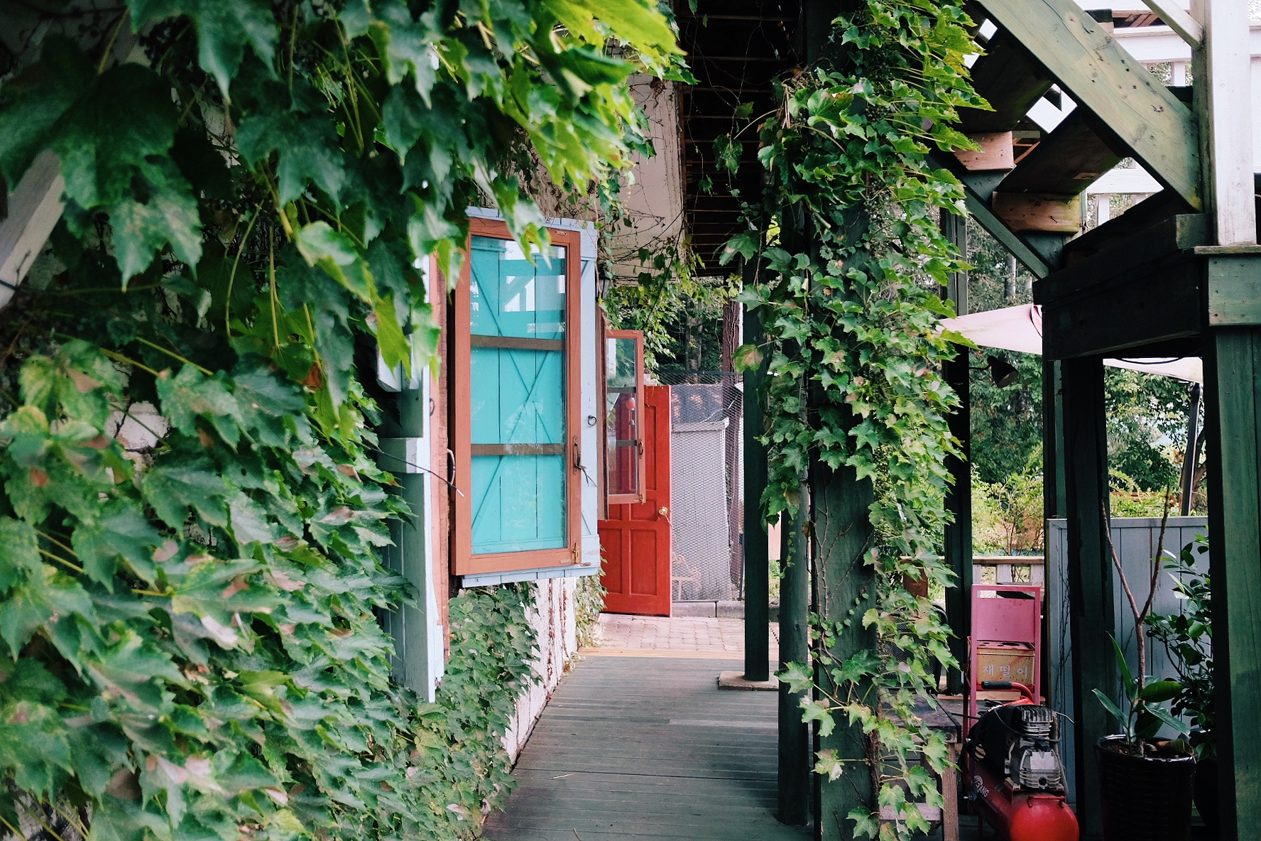 2층짜리 펜션 모습입니다. 원색 계열로 칠해진 문이 하얀 벽돌과 대비되어 참 예뻐요. 담쟁이덩굴이 펜션 주위를 감싸고 있어서 초록초록합니다. 펜션은 조금 낡은 듯보이지만, 사장님이 여기저기 꼼꼼하게 관리한 흔적이 엿보입니다.