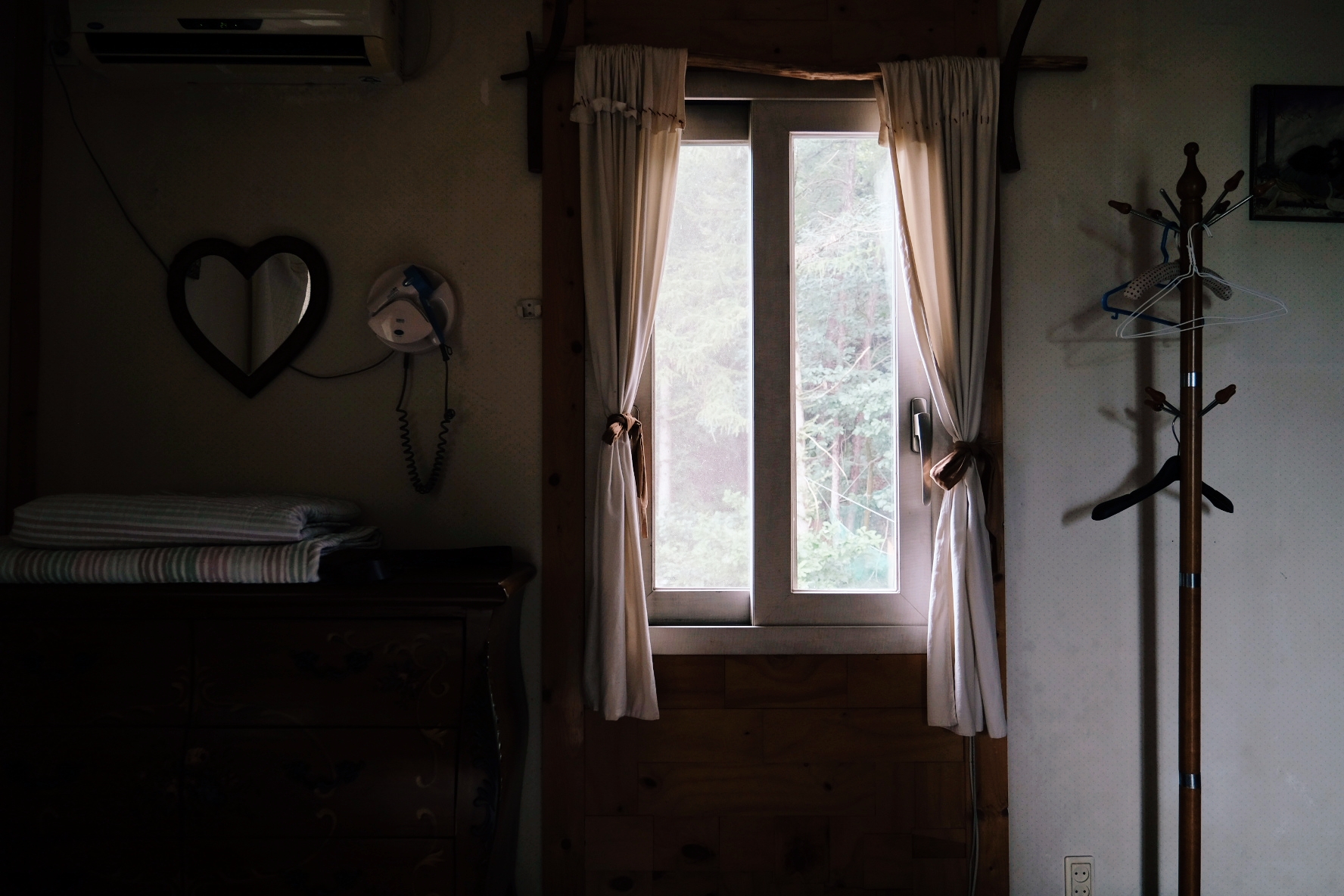 벽에는 드라이기가 설치되어 있었고, 옷걸이와 여분의 침구도 놓여있었습니다. 창 밖으로는 펜션의 뒷마당이 보입니다.