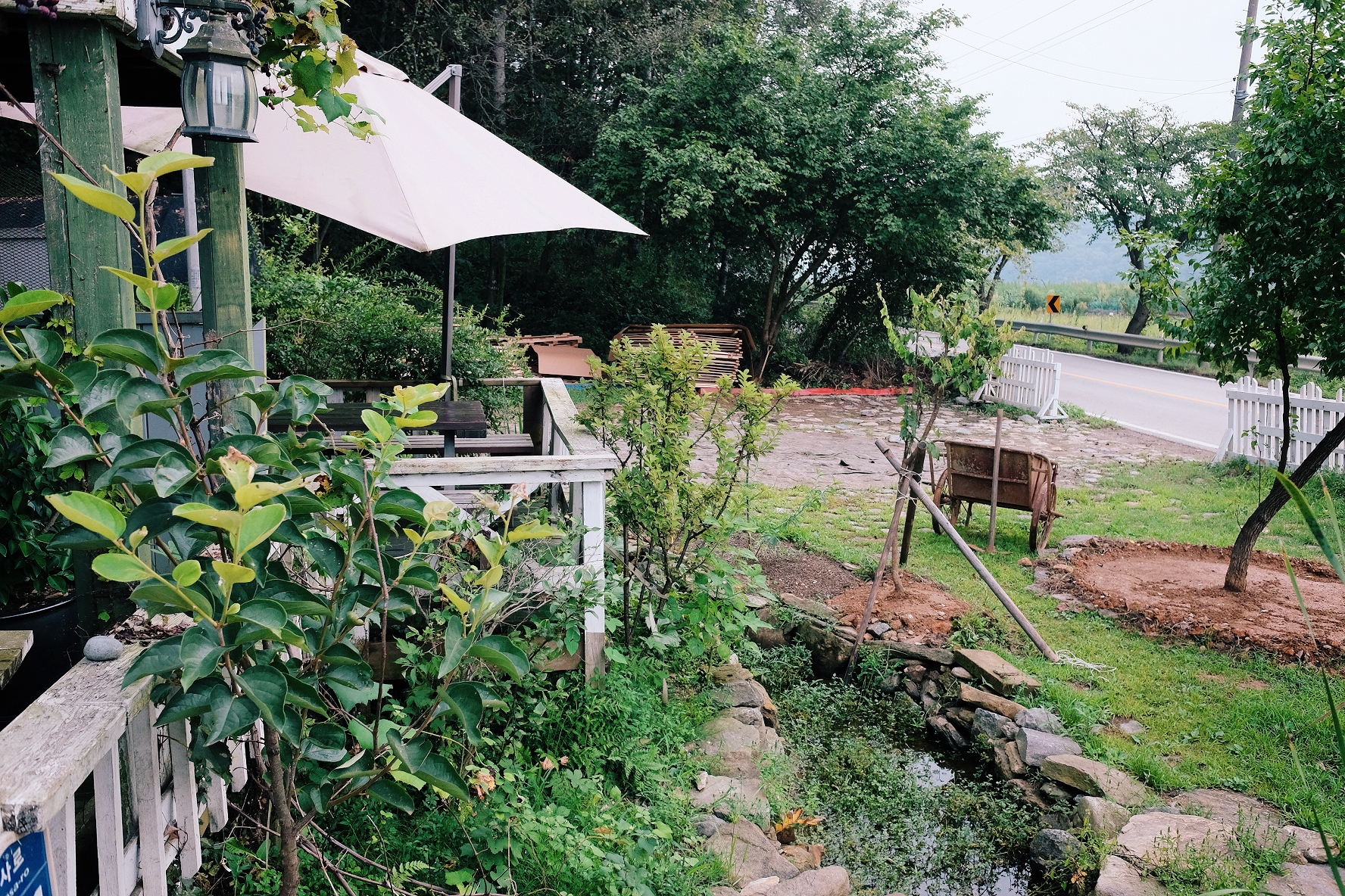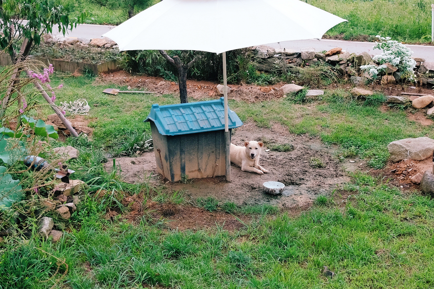 사장님 부부께서 키우시는 담돌이라는 강아지에요. 사진에는 안나왔지만 담순이도 있습니다. 더위를 피하라고 파라솔을 설치해 주셨더라고요. 사람이 와도 짖지 않고, 고양이가 나타날 때만 짖는 순둥이들입니다.