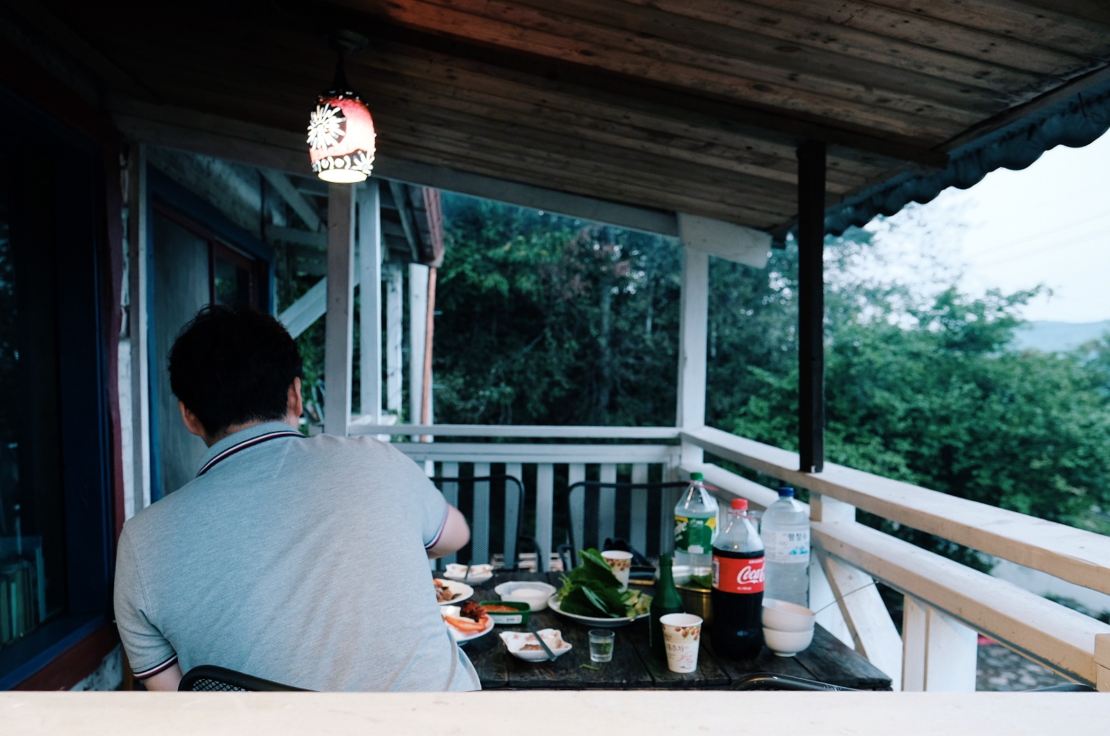 이 날은 손님이 저희 밖에 없기도 하고, 뒷마당 굴뚝에서 날아오는 연기 때문에, 4인용 자리를 이용했습니다. 앞에는 푸른 밭과 남한강강변이 보여서 분위기가 정말 좋았어요. 날씨는 좀 꾸물했지만요. 아예 비가 왔으면 더 운치가 있었을 것 같긴 해요.