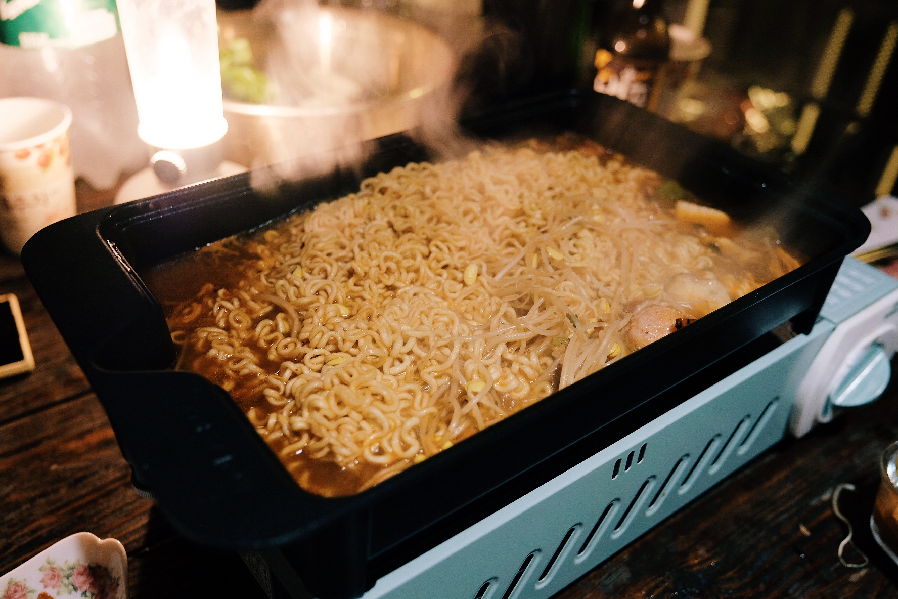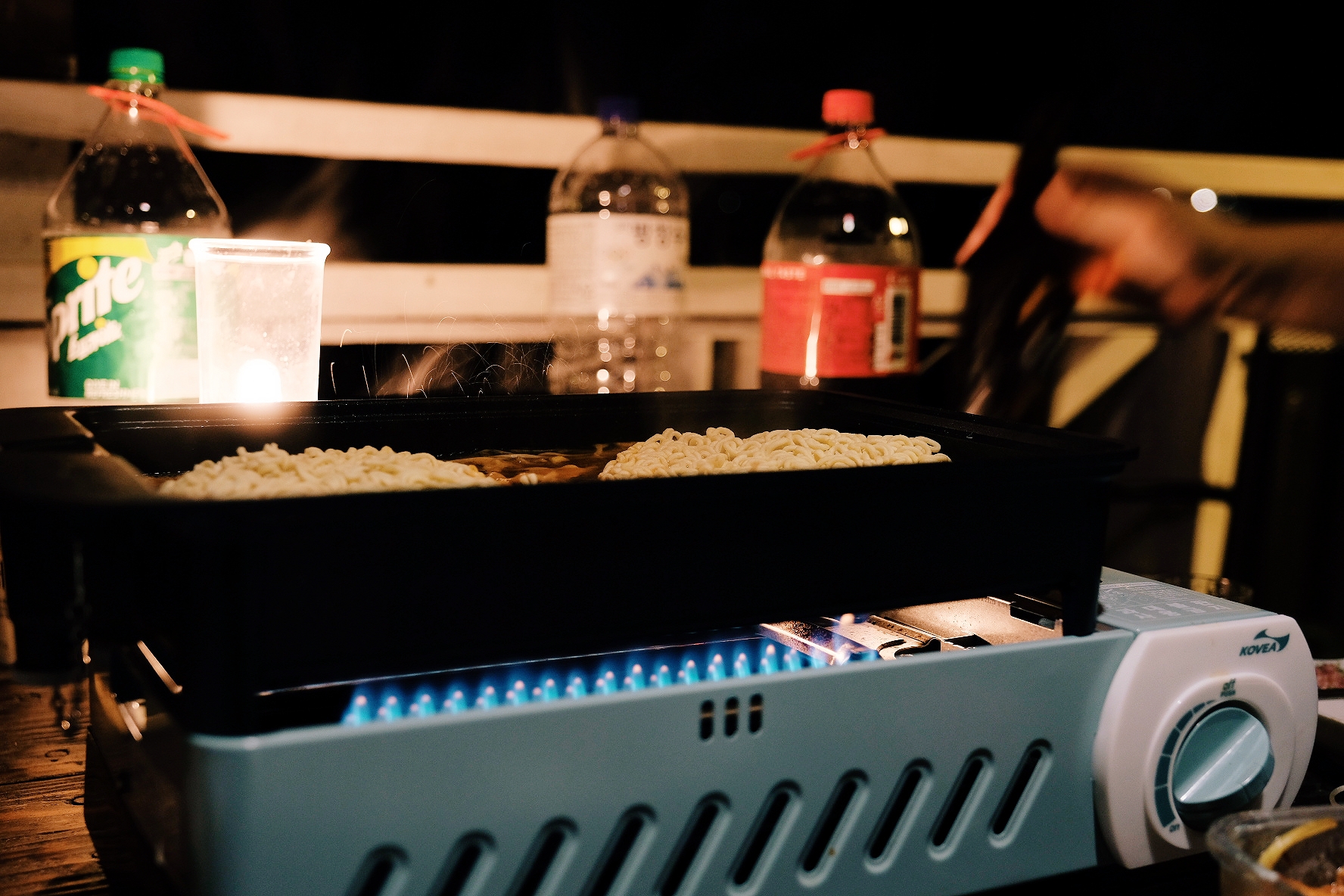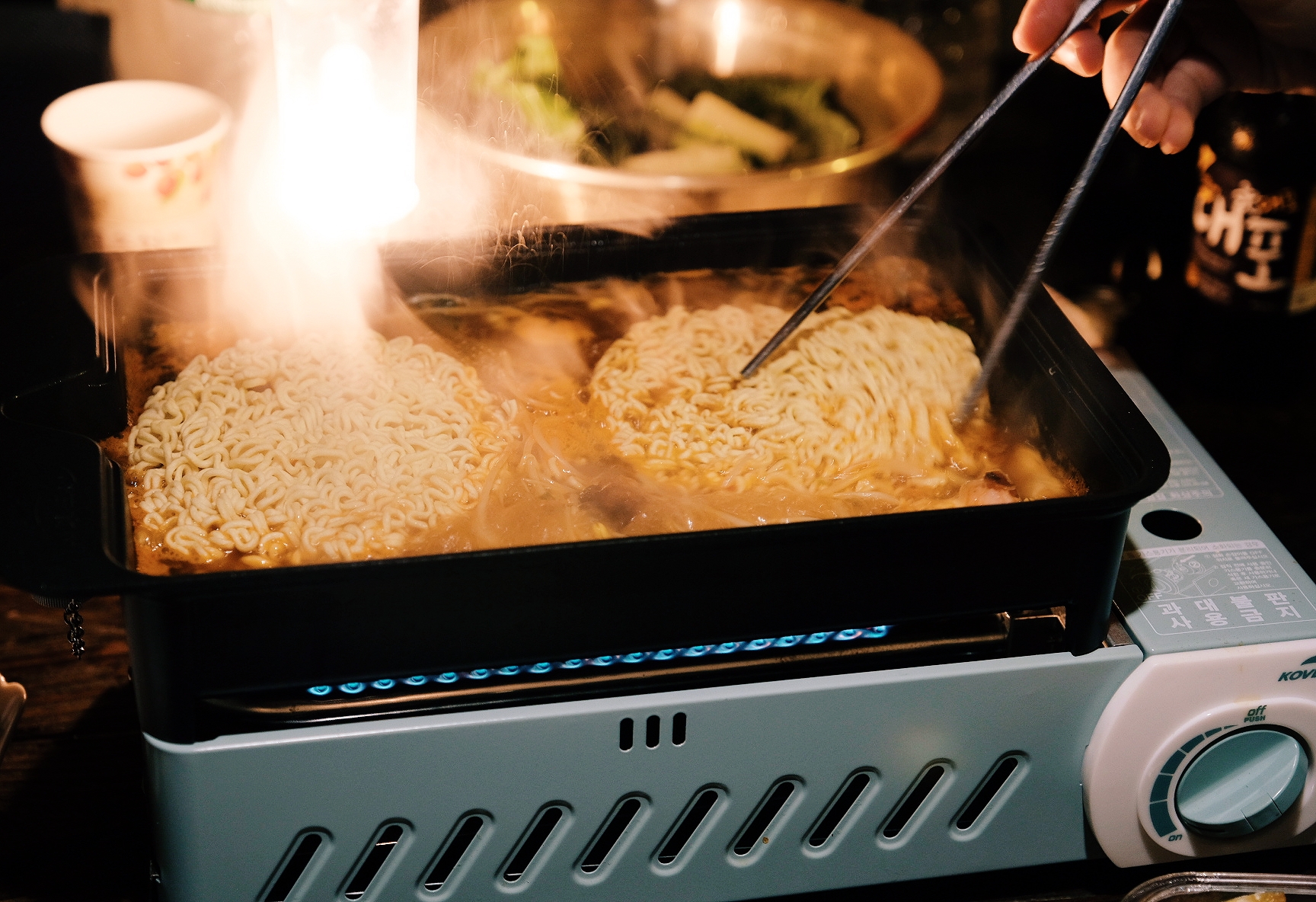 이제 구이바다를 테이블에 올려놓고 2차를 시작합니다. 바로 라면입니다. 단백질을 열심히 먹었으니 이제 탄수화물 타임이죠.