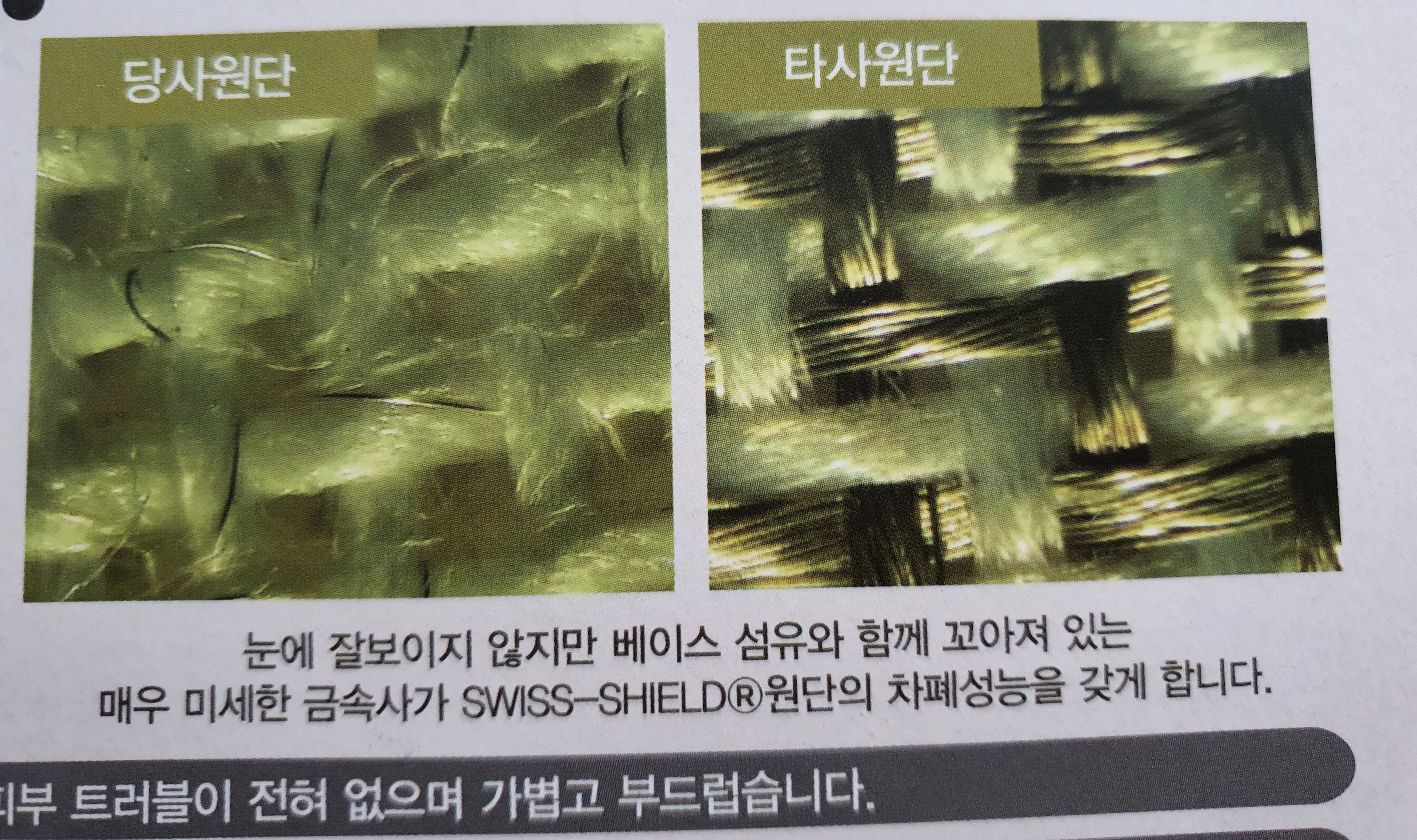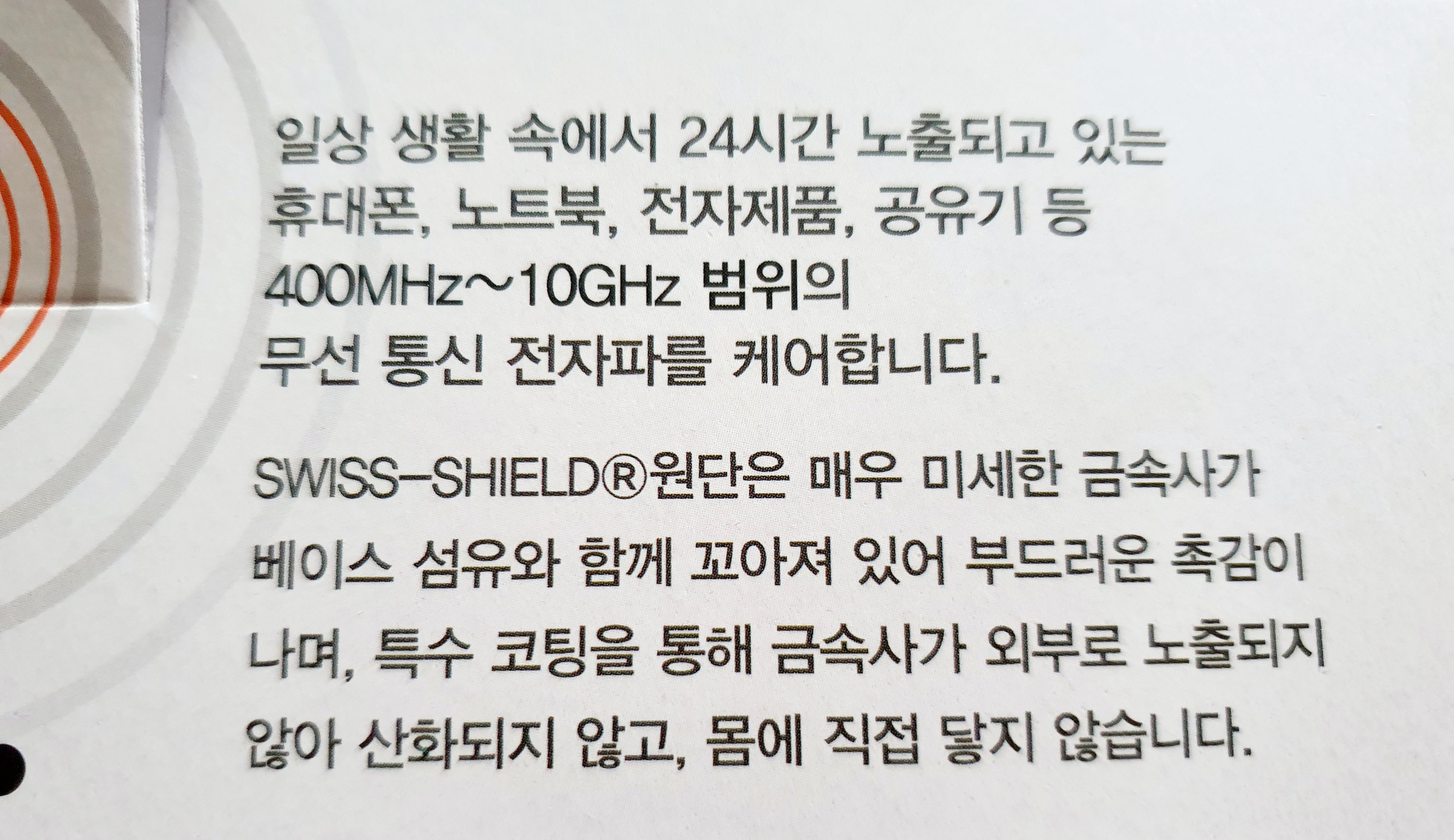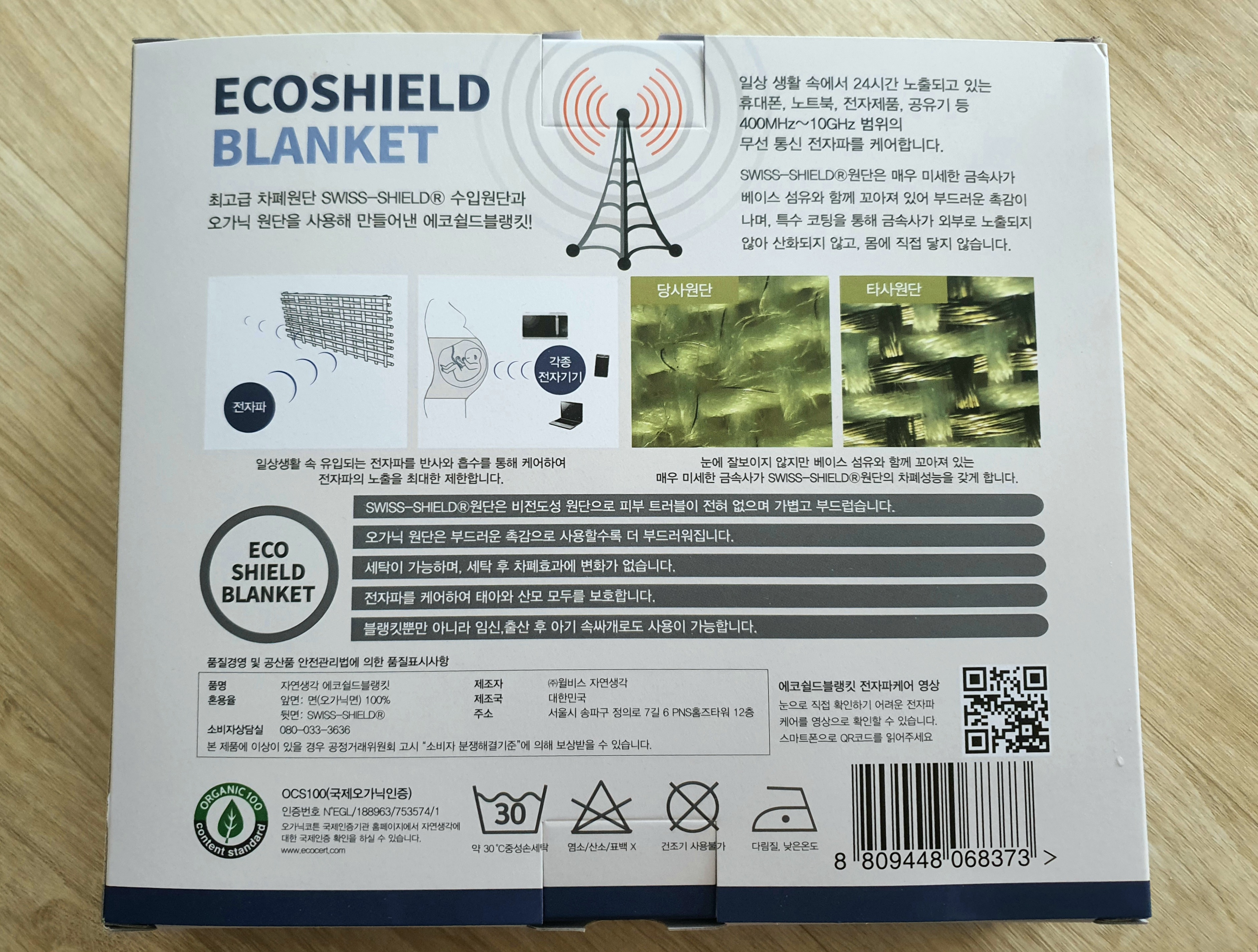 상자 뒷면에 제품 설명이 잘 되어 있어요. Made in Krorea(!)이고 국제 오가닉인증을 받았다고 합니다. 그리고 Swiss-Shield라는 차폐원단을 사용했다고 하네요.