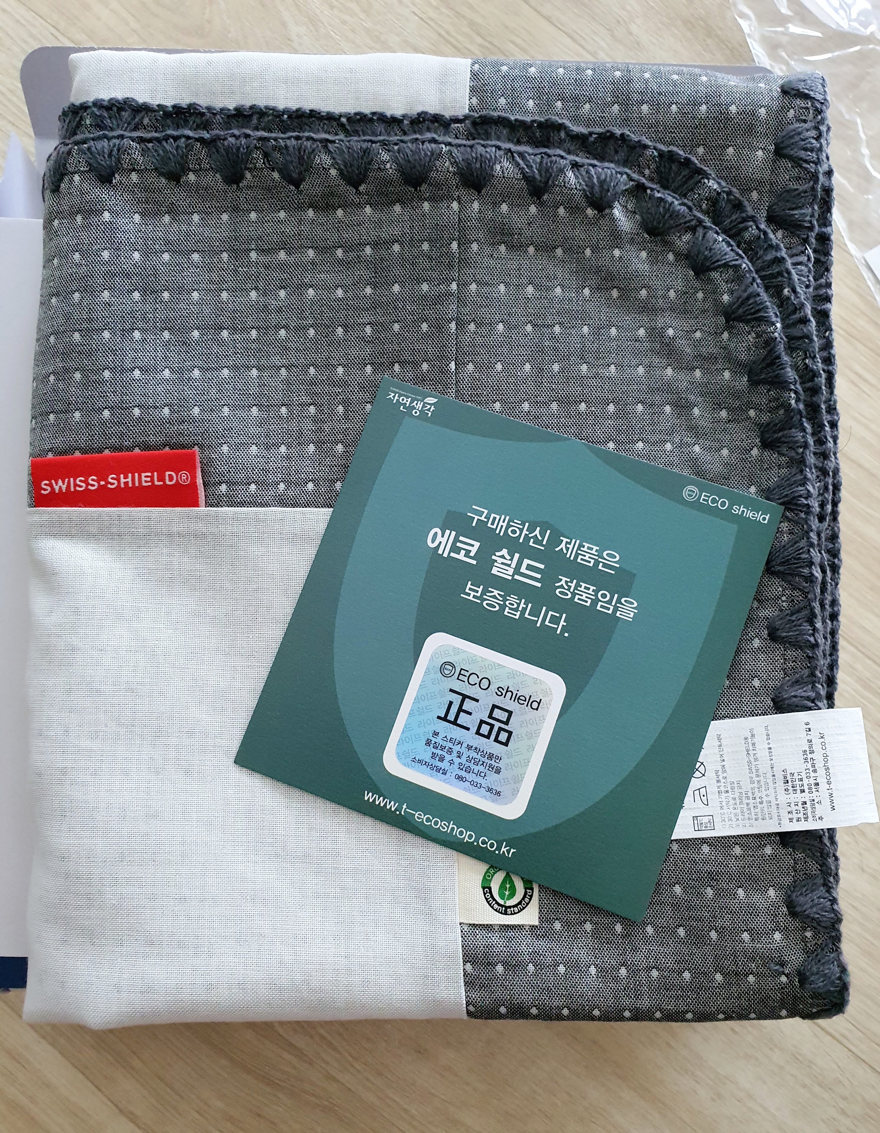 에코 쉴드 담요는 오가닉 면 100%이고, 제가 구입한 그레이 컬러는 거즈원단 소재로 약간 시원한 느낌이 납니다. 브라운은 좀 더 담요같은 느낌이 든다고 하네요.