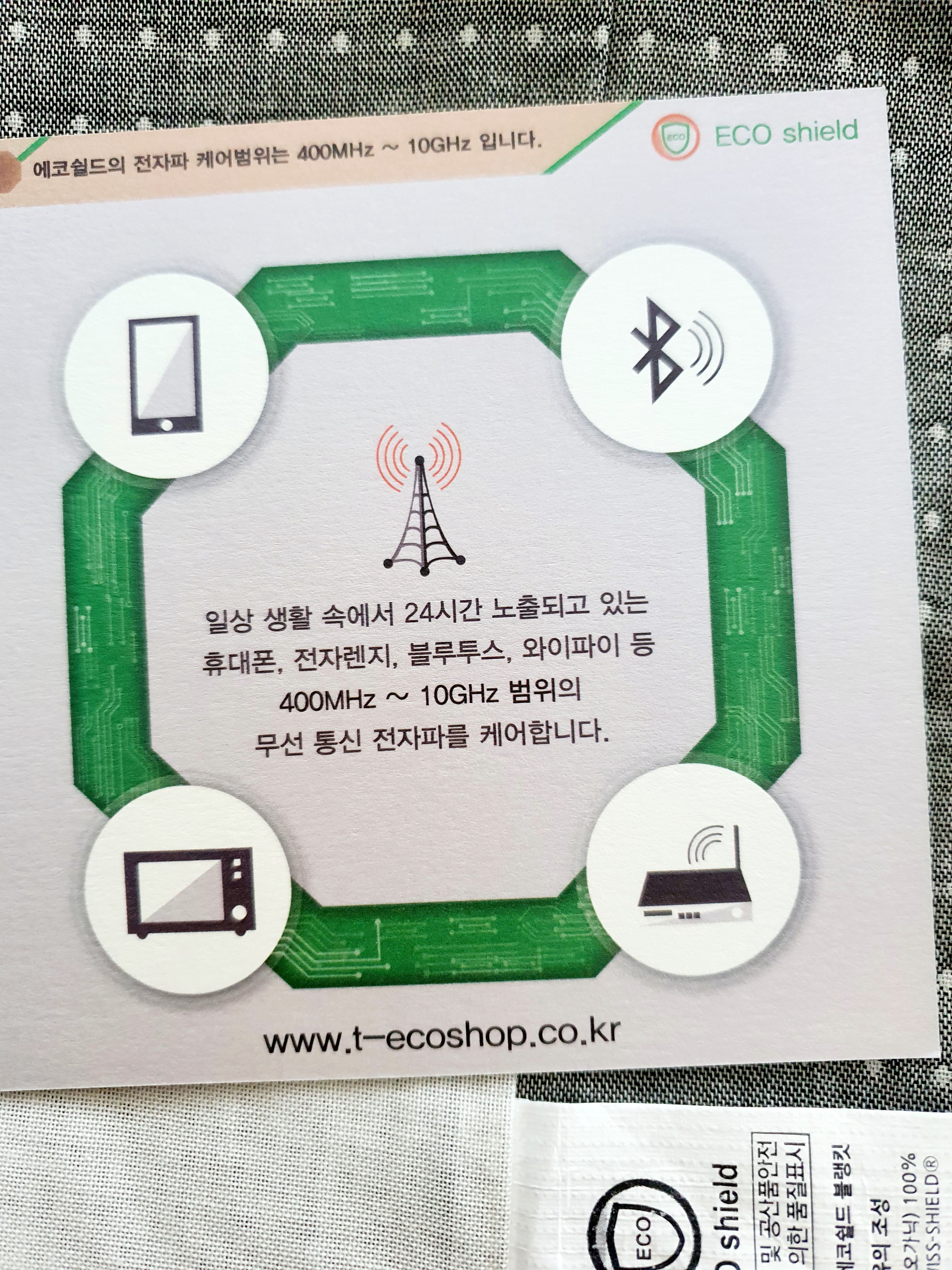 400MHz ~ 10GHz 범위의 무선 통신 전자파를 케어한다고 합니다. 전자레인지에서는 700~800MHz 정도, 와이파이는 2.4GHz, 5G는 3.5~28GHz 주파수를 쓴다고 하니, 사실 전자파 차단 담요가 만능은 아닙니다. (하지만 안 쓰는 것보단 쓰는 게 조금이라도 낫지 않을까 하는...ㅠㅠ) 저주파/극저주파 전자기장은 차단하지 못하기 때문이에요. 특히 극저주파 전자기장은 소아백혈병과의 연관성이 있다고 판단되는 만큼 조심하는 것이 좋겠지만, 극저주파 전자기장을 차단하는 담요는 없는 것 같아요.