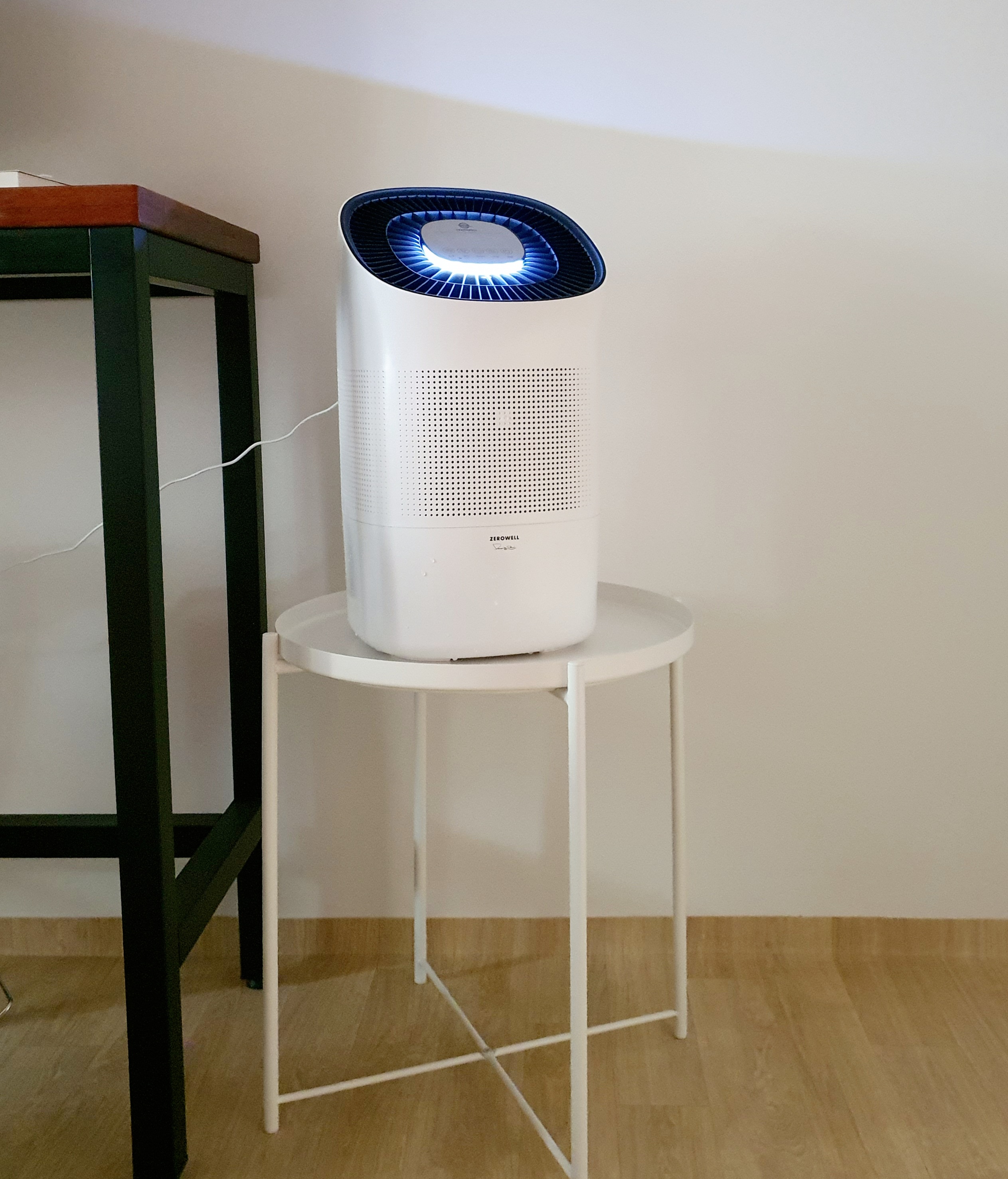 발뮤다 가습기의 서식처였던 이케아 글라돔 위에 제로웰 가습기를 올려놓았습니다. 같은 흰색이라 나름 조화롭습니다. 발뮤다 가습기를 올려놨을 때는 꽉 찬 느낌이었는데, 제로웰가습기는 발뮤다 가습기보다는 크기가 작아서 약간 심심해 보이기도 하네요.