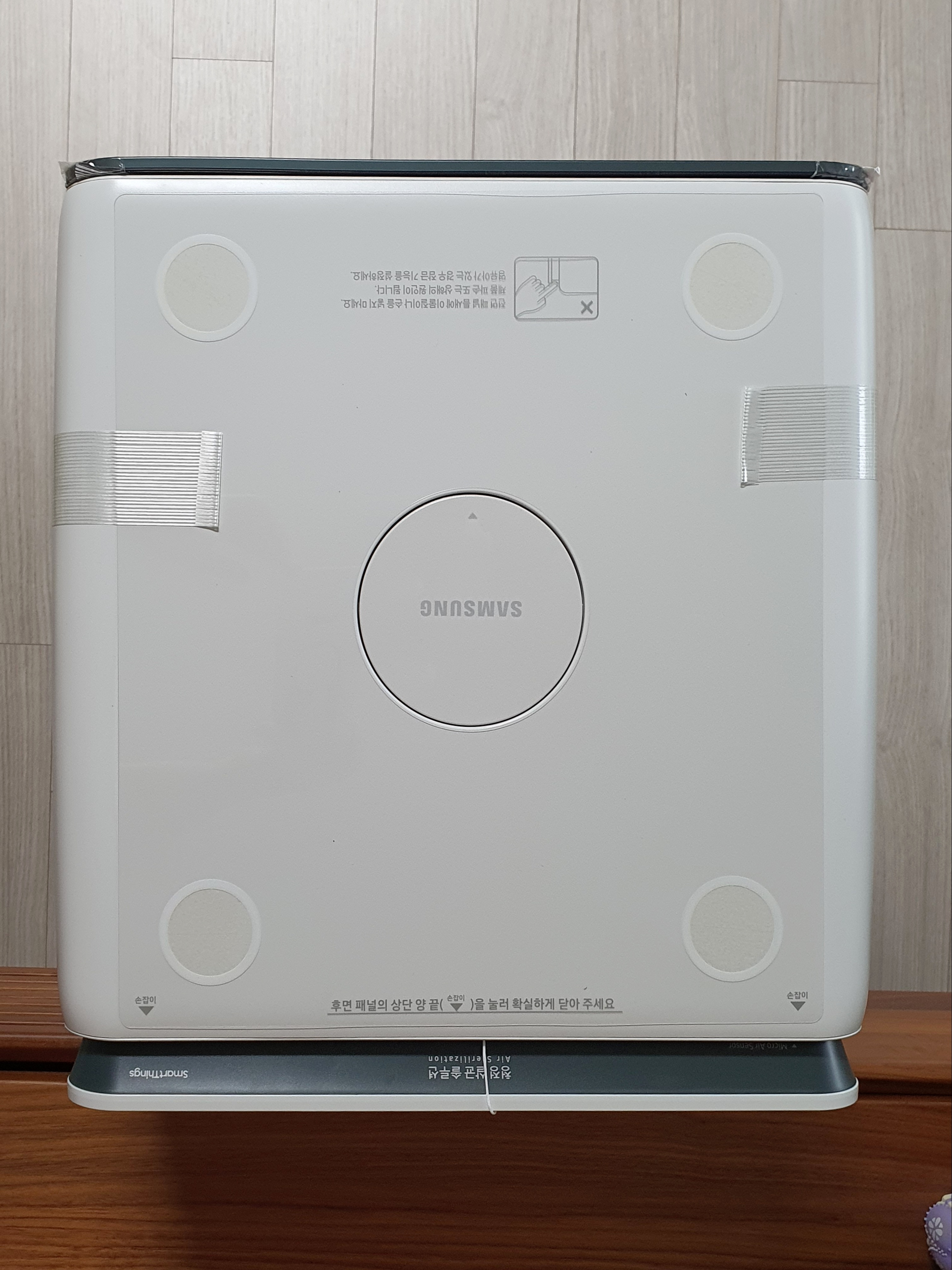 공기청정기 윗부분에 붙어있는 테이프들을 깔끔히 떼어 냅니다. 가운데 동그란 부분은 공기청정기 결합부로 작은 큐브 공기청정기를 결합할 때 사용합니다. 사진 윗부분이 깨끗해진 공기가 나오는 전면 패널, 아랫부분(청정 살균 솔루션이 써 있는 부분)이 공기가 들어가는 후면 패널이에요.