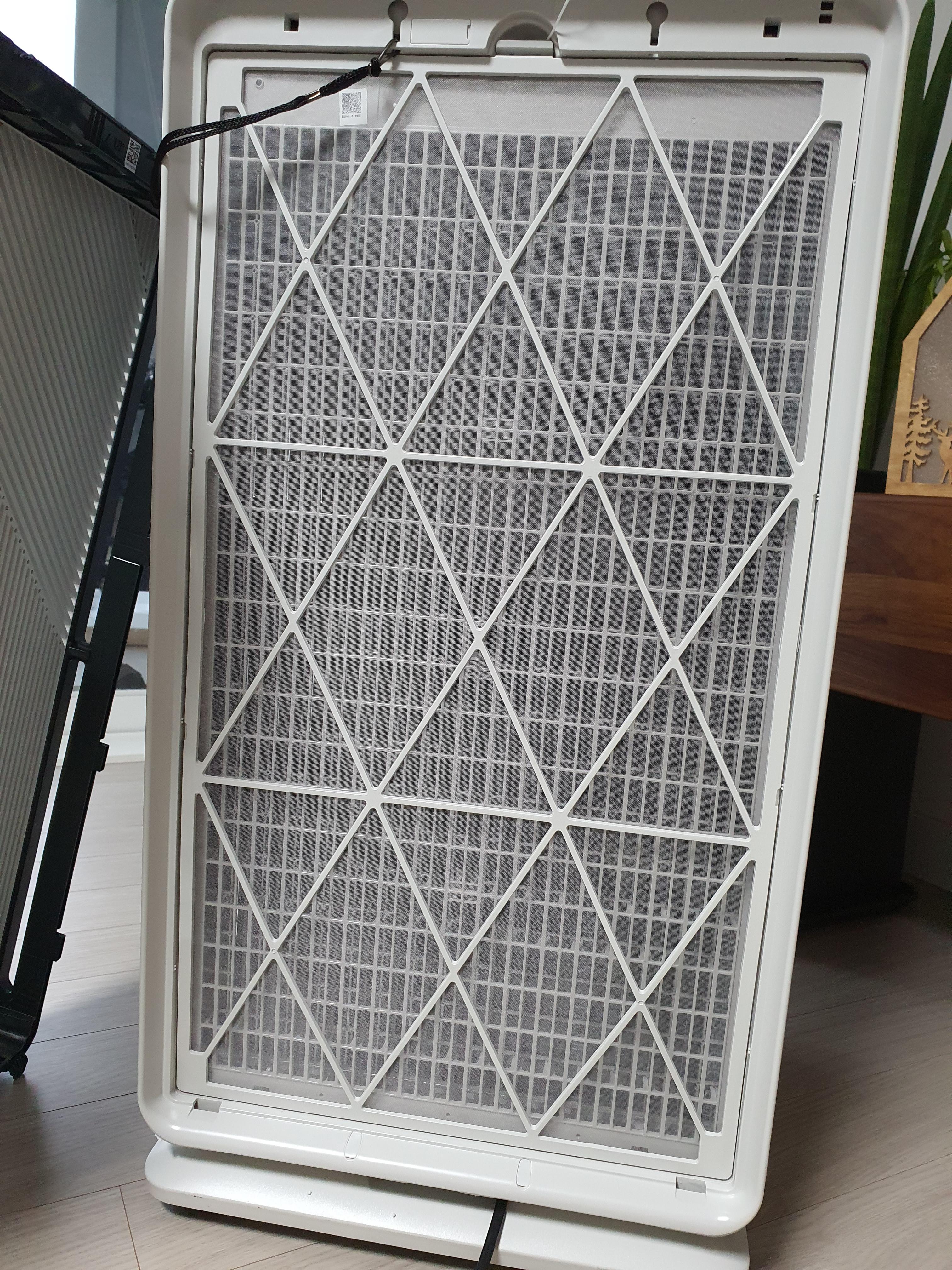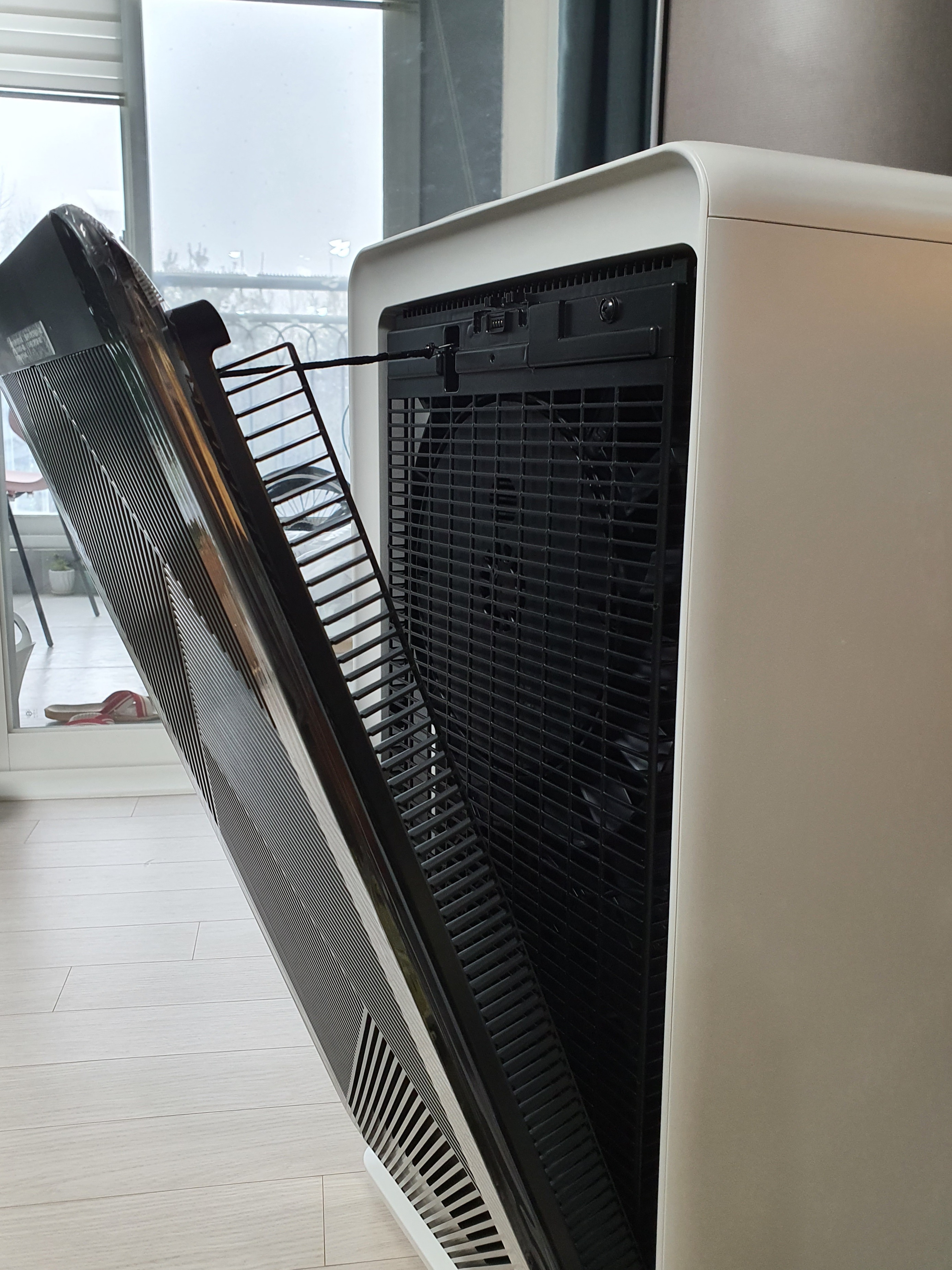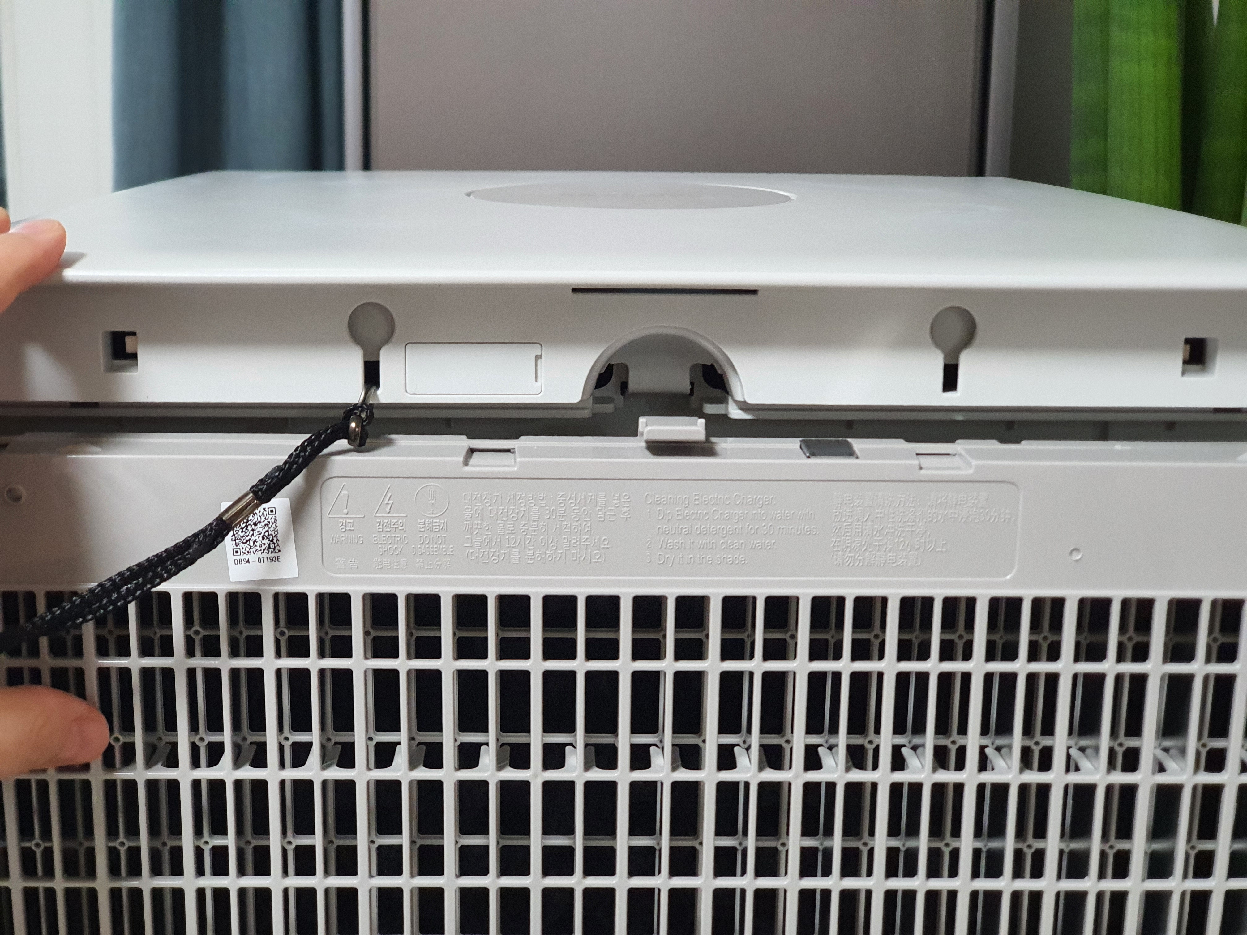 후면 패널은 흰색이에요. 남편은 이쪽이 전면 패널인 줄 알았대요. 전면 패널과 마찬가지로, 본체와 끈으로 연결되어 있습니다. 열어서 옆에 세워두고 필터 셋팅 작업을 시작했습니다.
