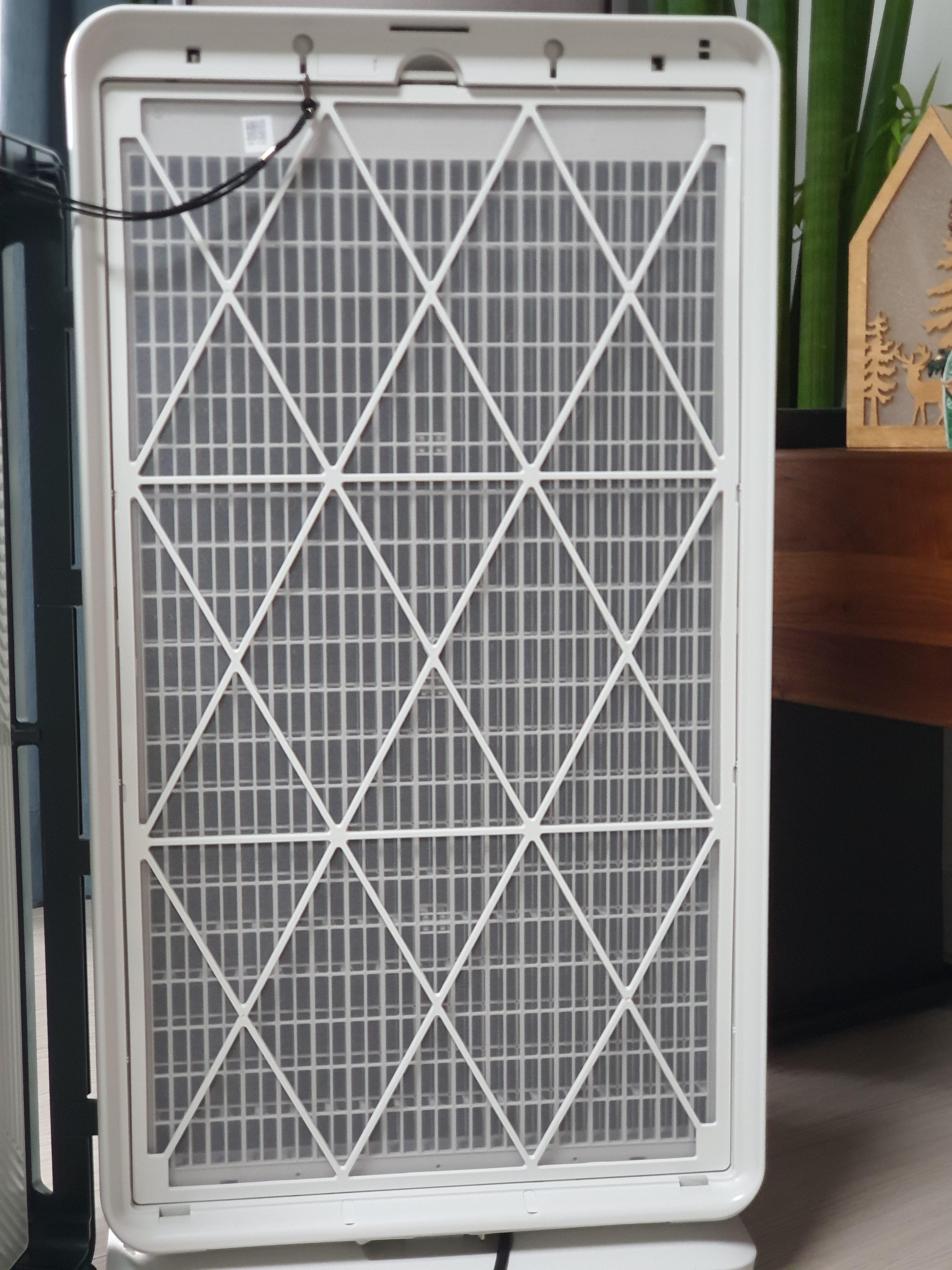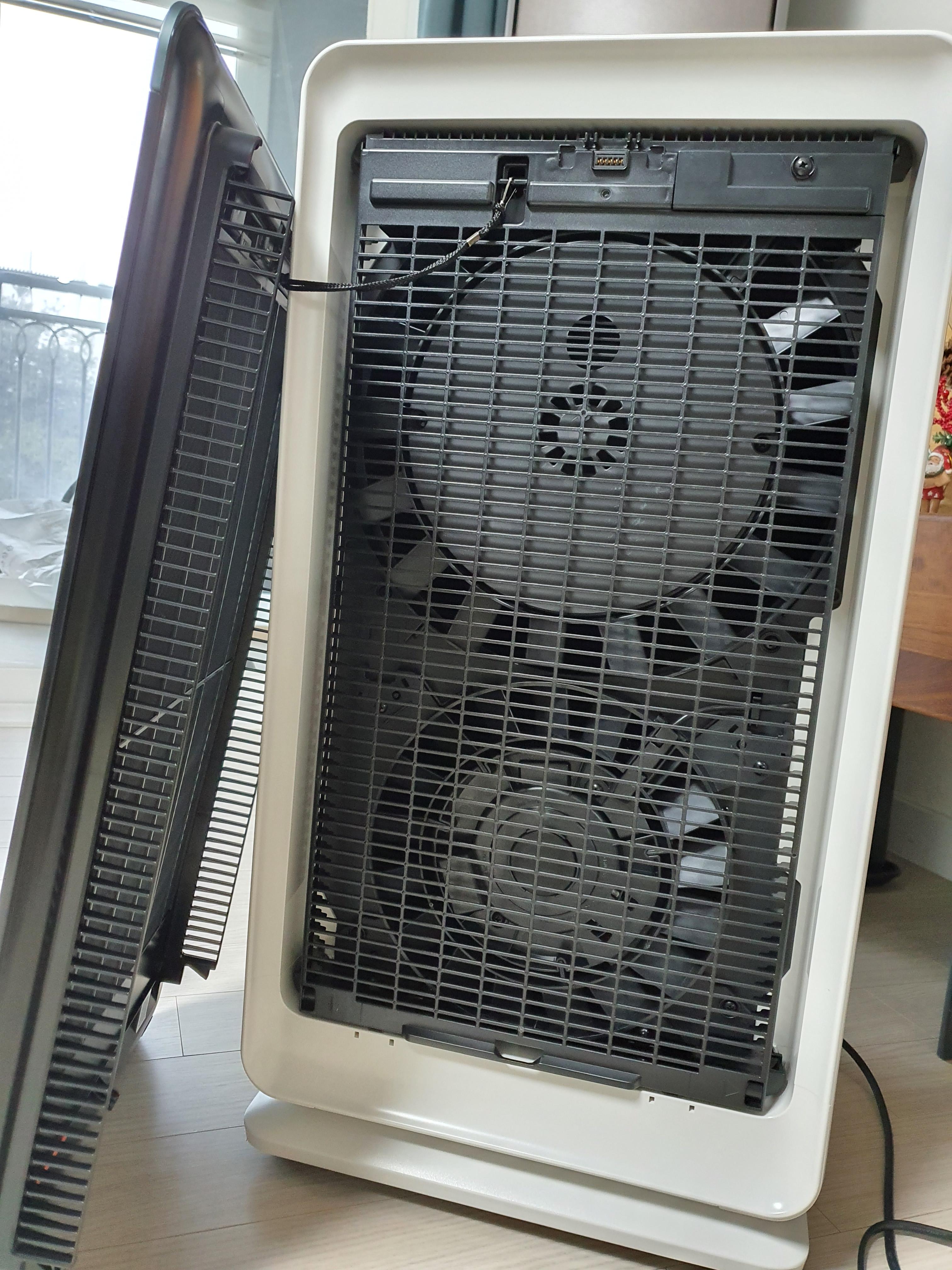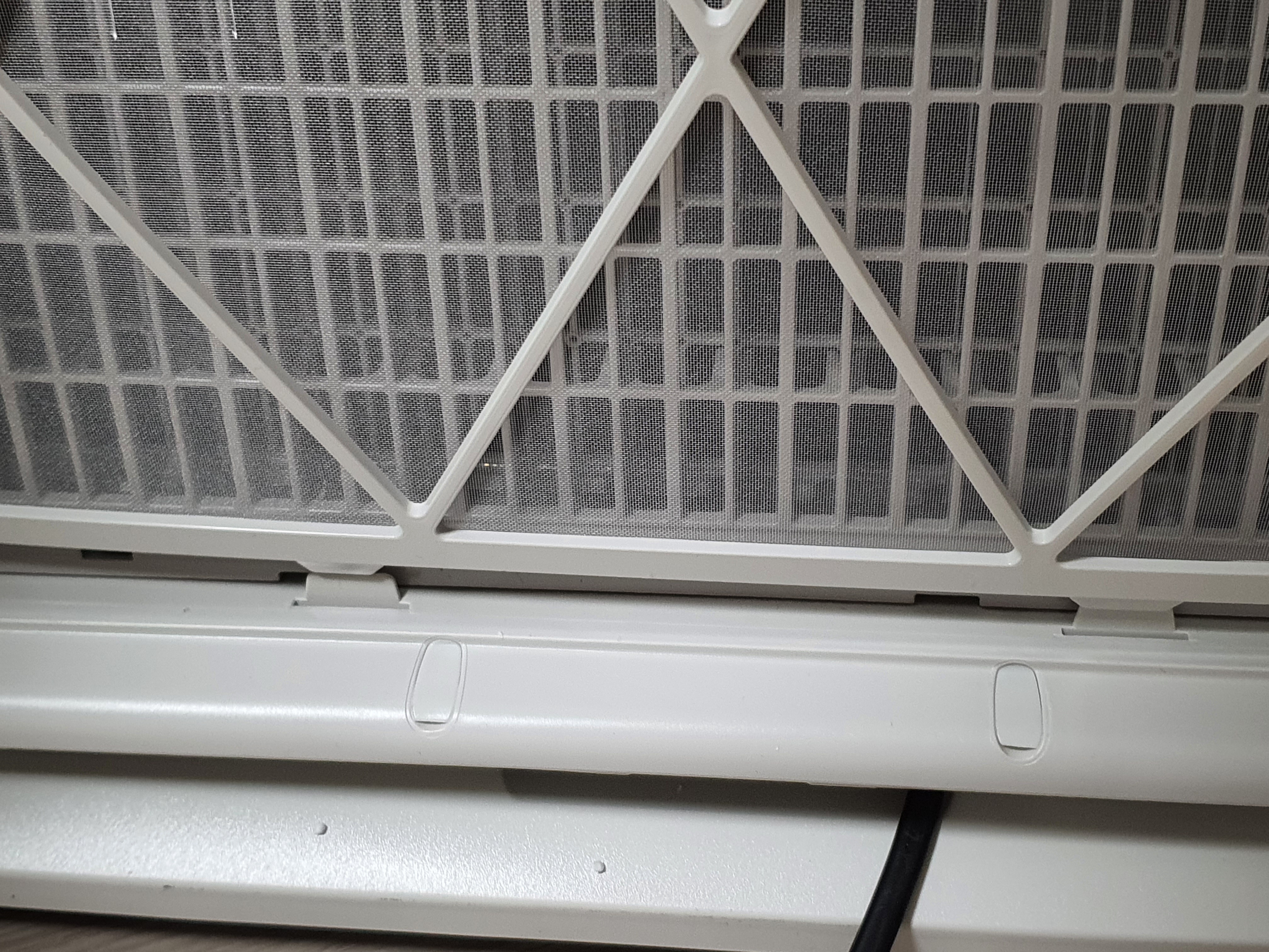 후면 패널은 흰색이에요. 남편은 이쪽이 전면 패널인 줄 알았대요. 전면 패널과 마찬가지로, 본체와 끈으로 연결되어 있습니다. 열어서 옆에 세워두고 필터 셋팅 작업을 시작했습니다.
