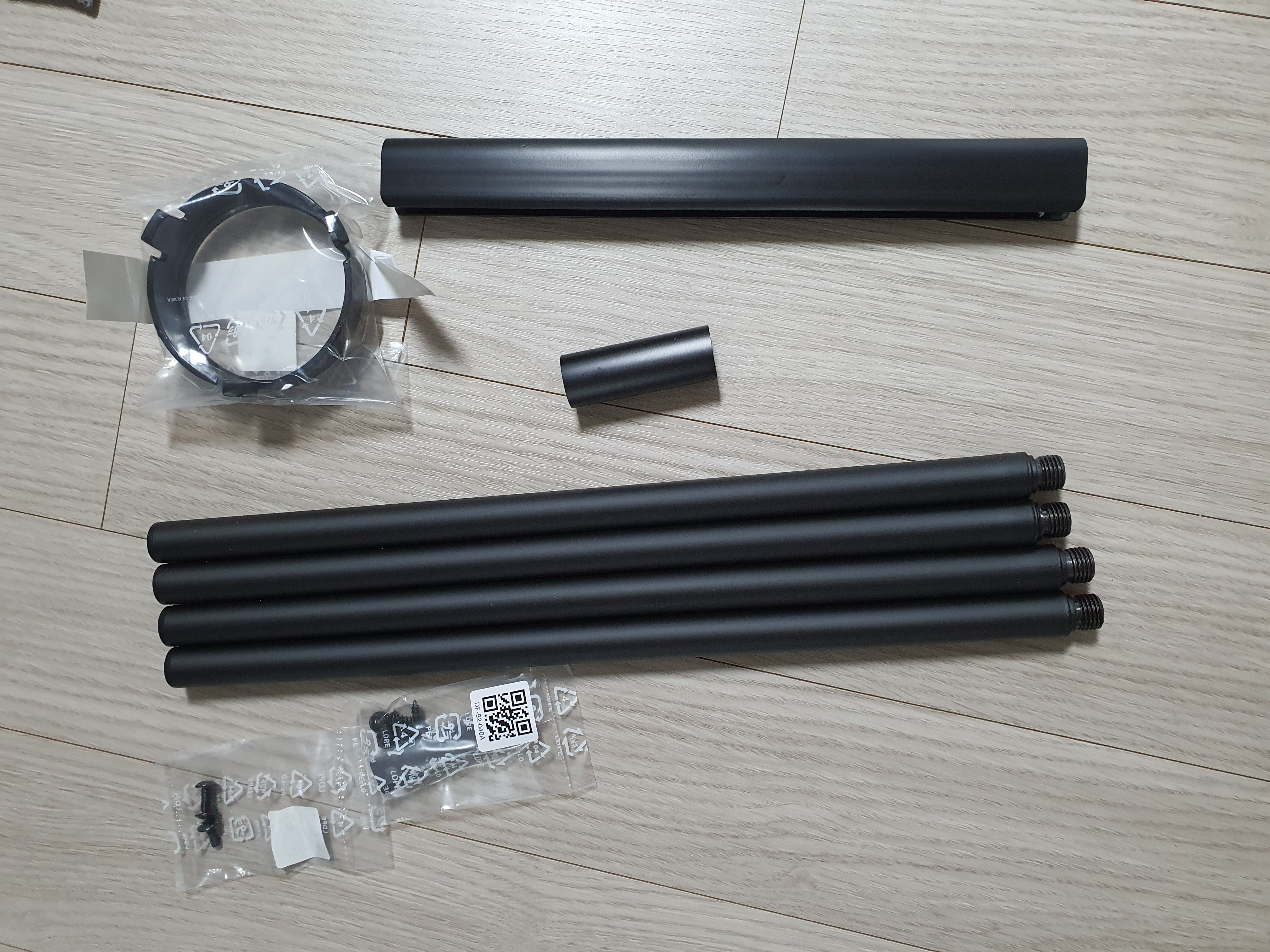 다리 4개와 나사, 케이블 홀더, 케이스 스탠드(공청기용), 테이블이 들어있습니다.