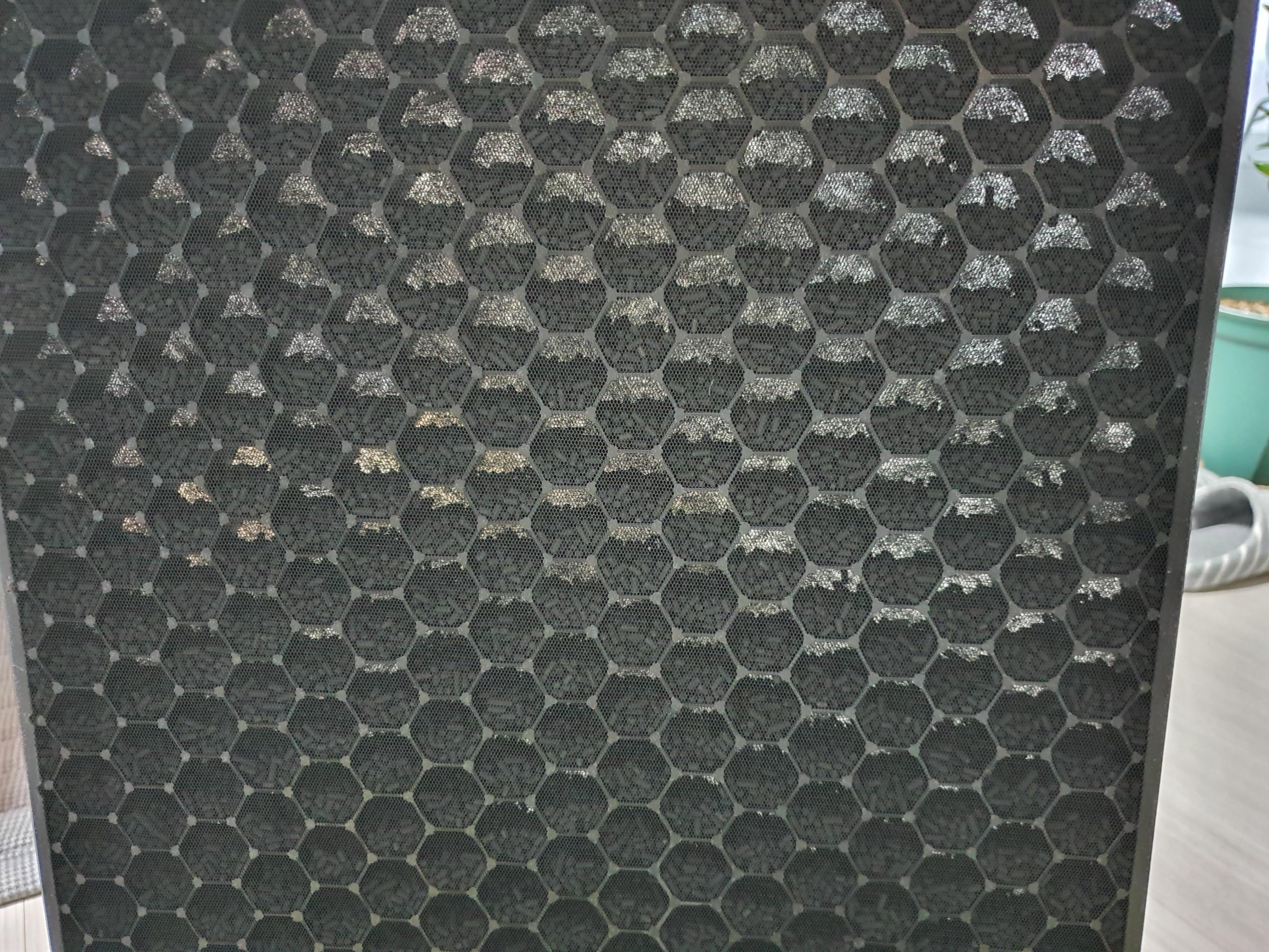 필터는 위쪽 가운데 동그란 홈을 눌러주면 하나씩 뺄 수 있습니다. 가장 처음 보이는 다이아몬드 패턴의 필터는 극세 필터입니다.