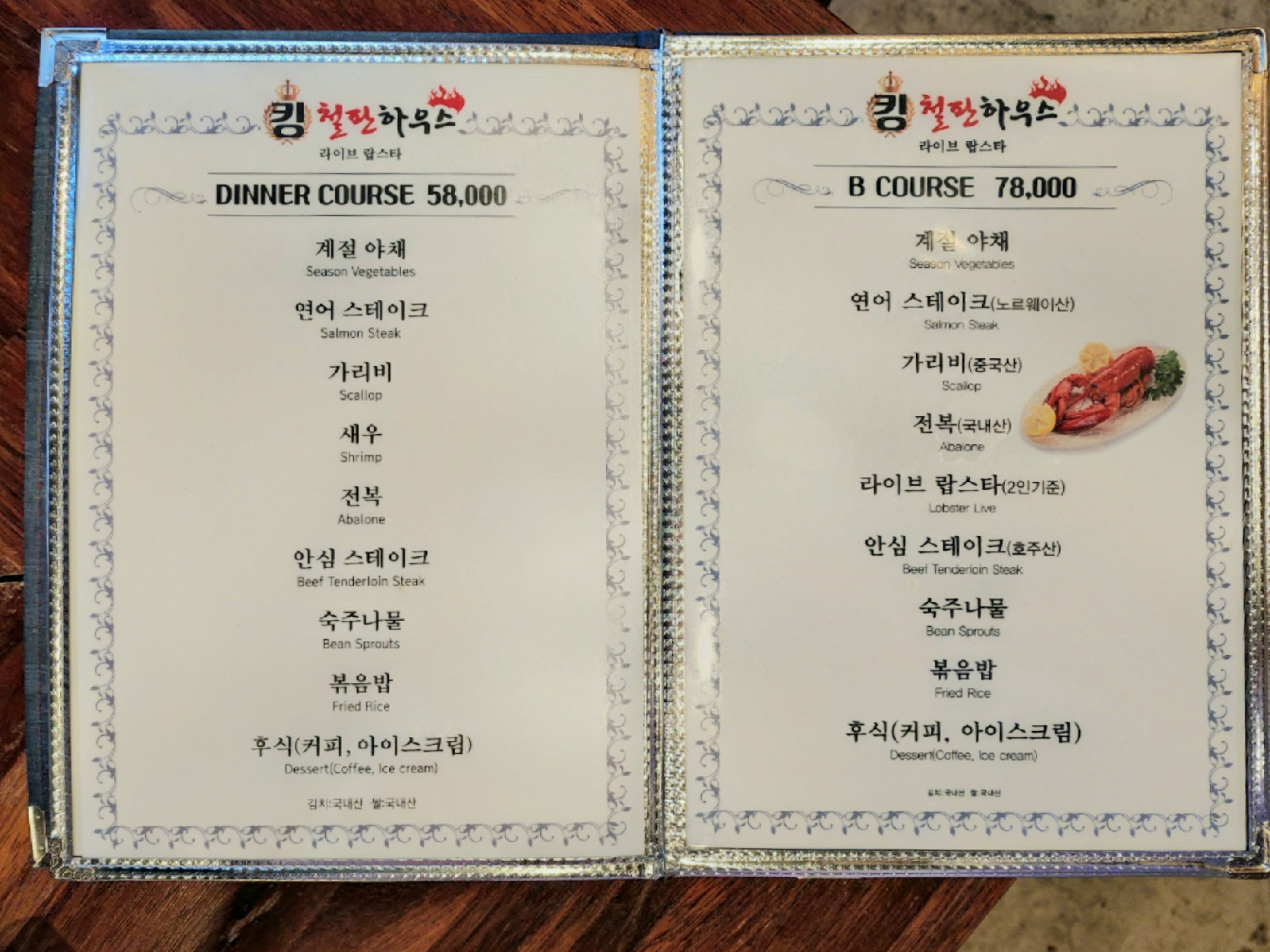 코스 요리로 디너코스(58,000원)과 B코스(78,000원), A코스(98,000원)가 있습니다. 저희는 디너코스를 선택했어요. B코스에는 디너코스에 라이브랍스타가 추가되고, A코스는 B코스에 메로구이와 양갈비스테이크와 추가되네요.