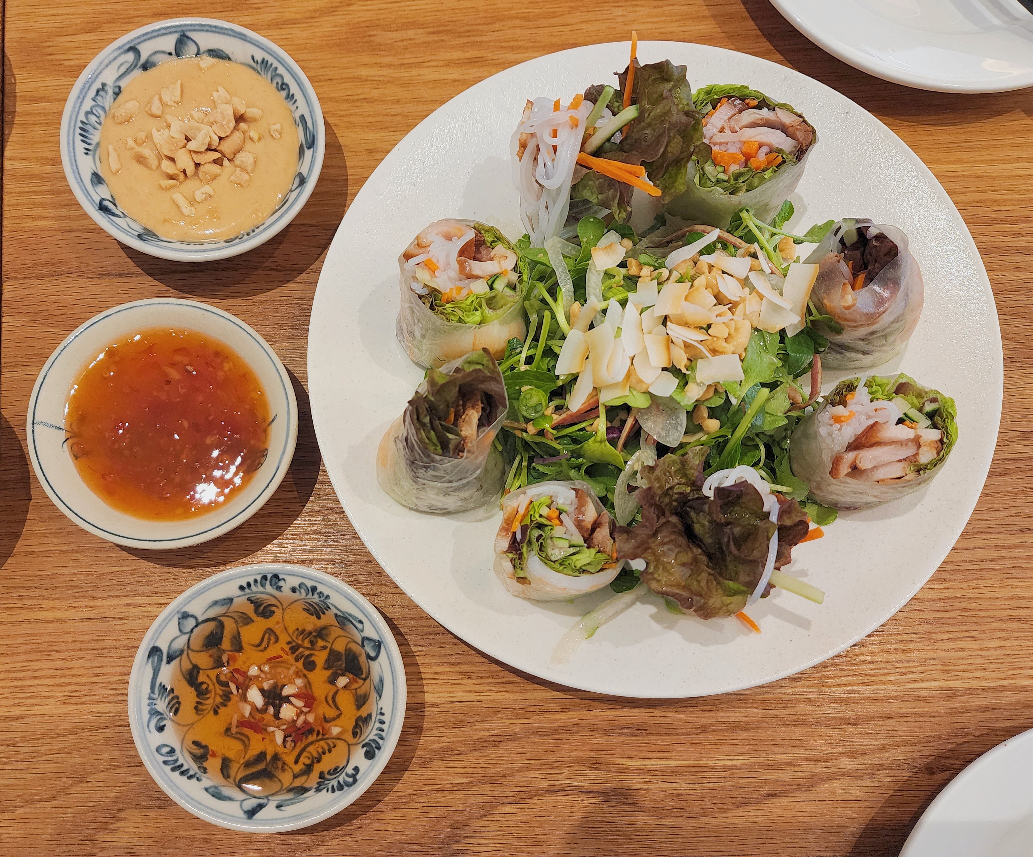 고이꾸온은 돼지고기와 새우, 각종 채소가 들어간 월남쌈 샐러드 요리입니다. 가운데에 상큼한 야채 샐러드가 있고, 8개의 월남쌈이 주위를 둘러쌓았습니다. 야채와 돼지보쌈고기가 어우러진 월남쌈은 애피타이저로 좋은 선택이었어요. 반쎄오를 먹다가 조금 느끼한 듯싶으면 샐러드로 입가심을 했습니다.