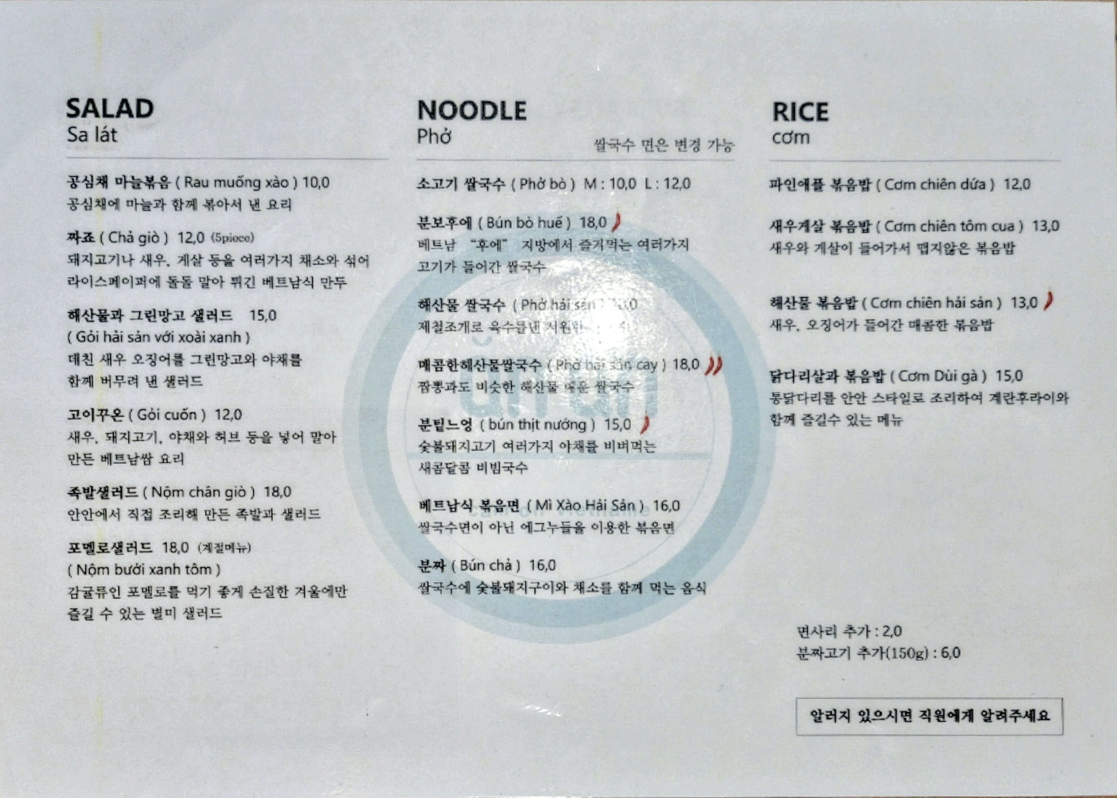 메뉴판입니다. 저희는 안안의 대표 메뉴인 반쎄오를 첫번째로 주문했습니다. 후기를 훑어보았는데 샐러드는 전체적으로 평이 다 좋아서 고민을 많이 했어요. 쌀국수나 볶음밥은 맛있다 or 무난하다는 평이 많았네요. 심사숙고 끝에 샐러드는 고이꾸온(새우, 돼지고기, 야채와 허브 등을 넣어 말아 만든 베트남쌈 요리), 누들은 분팉느엉(숯불돼지고기 여러가지 야채를 비벼먹는 새콤달콤 비빔국수)을 선택했습니다.