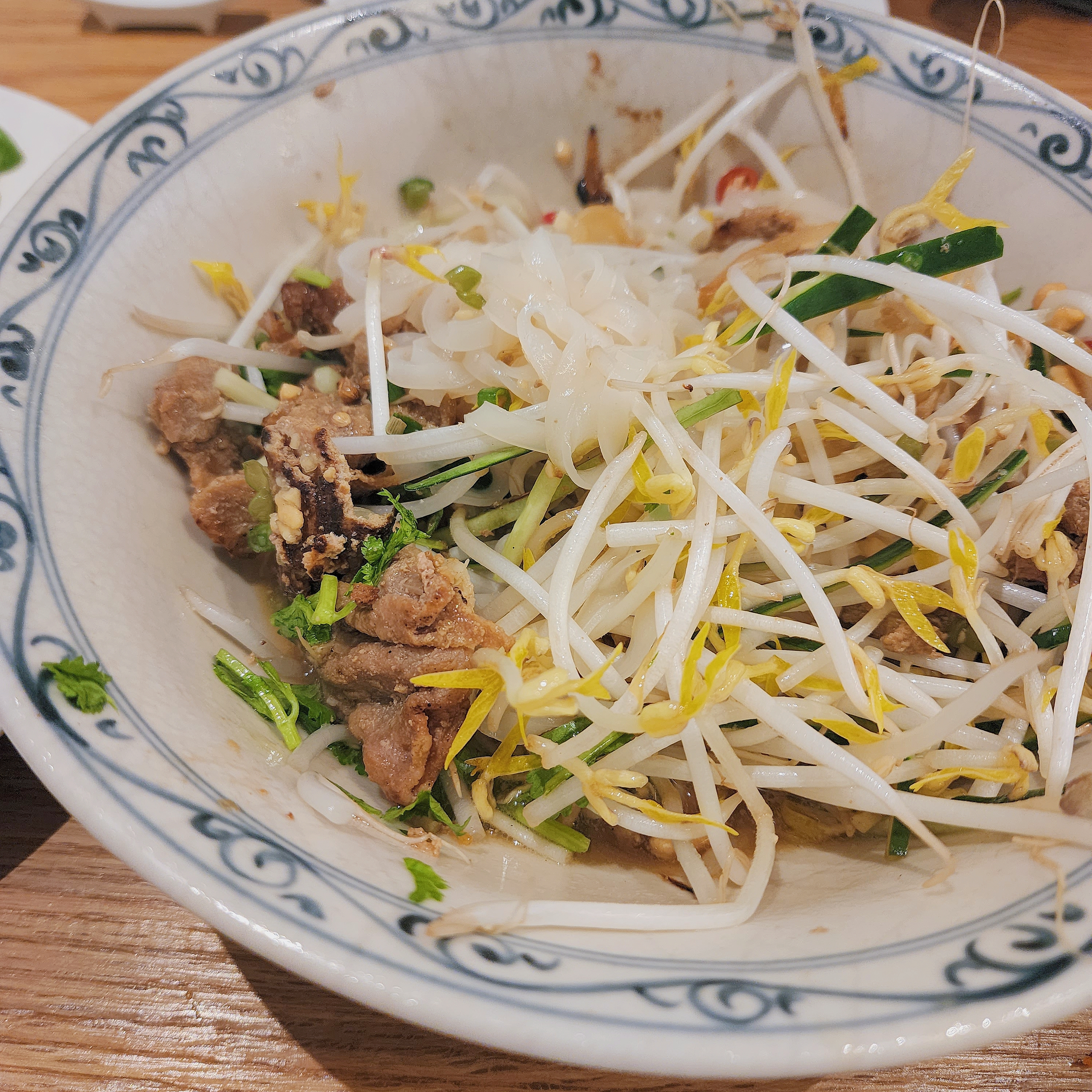 분팉느엉을 먹을 때 면과 숙주나물 밑에 숯불 돼지고기가 깔려있어서 잘 비벼 드시면 됩니다. 나중에 고수도 좀 더 추가해서 먹었더니, 정말 베트남 느낌 가득한 맛이 났네요.