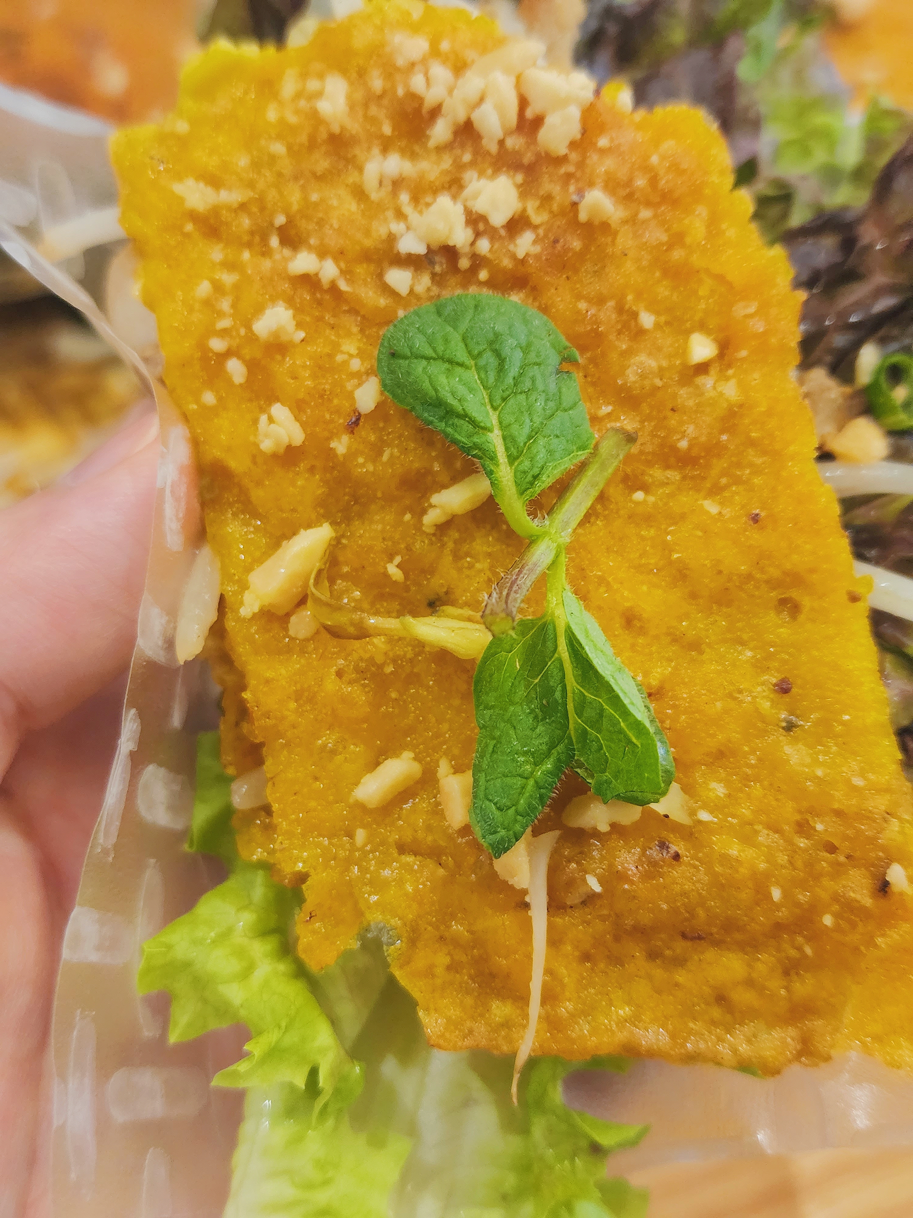 반달모양의 반쎄오를 먹기 좋은 크기로 자릅니다(이건 직원분이 직접 해 주셨어요). 그리고 라이스페이퍼에 상추를 깔고 반쎄오와 면, 스피아 민트를 올린 후, 라이스페이퍼를 돌돌 말아 잘 포장해 줍니다. 이제 느억맘 소스에 꾹 찍어서 먹으면 됩니다.