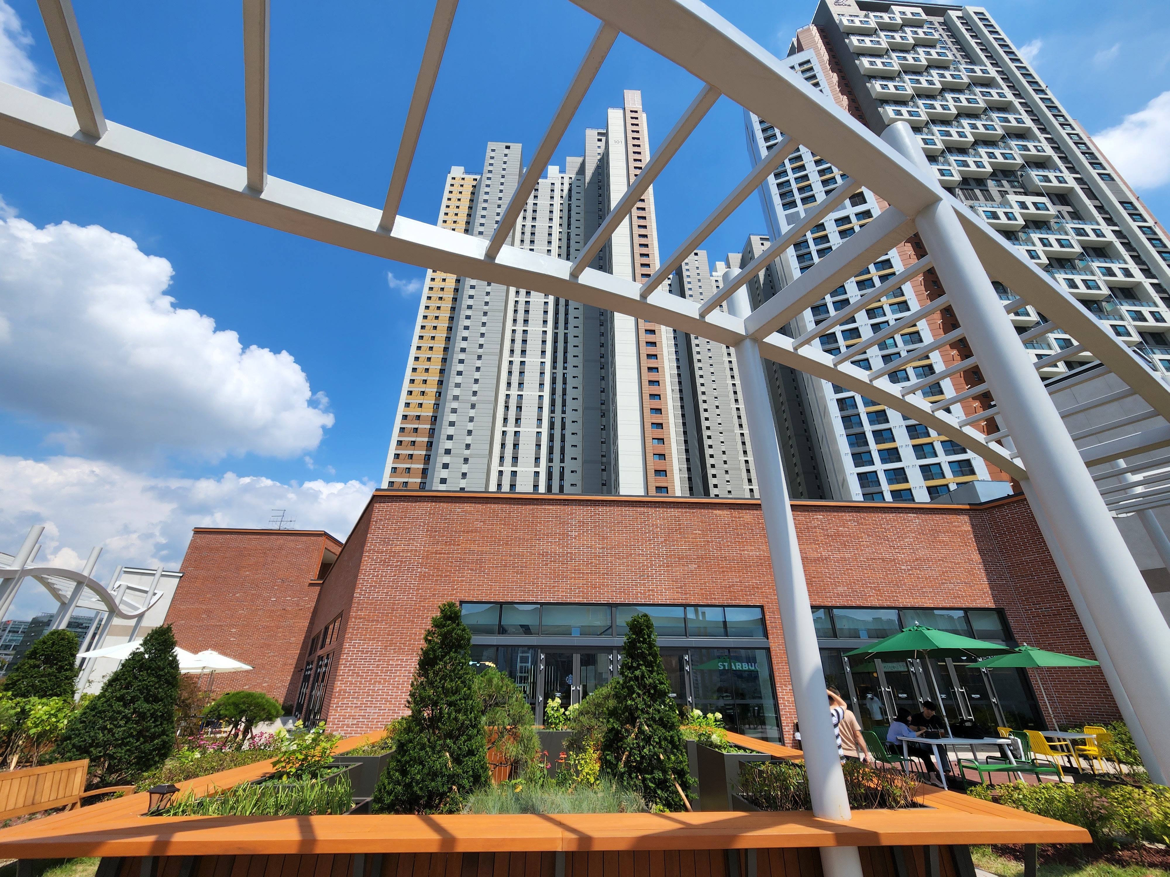 옥상 정원으로 나와보았습니다. 7월의 햇빛은 뜨겁지만, 습도가 낮은 편이라 야외 테이블에서 커피를 마시는 사람들도 종종 보였습니다.