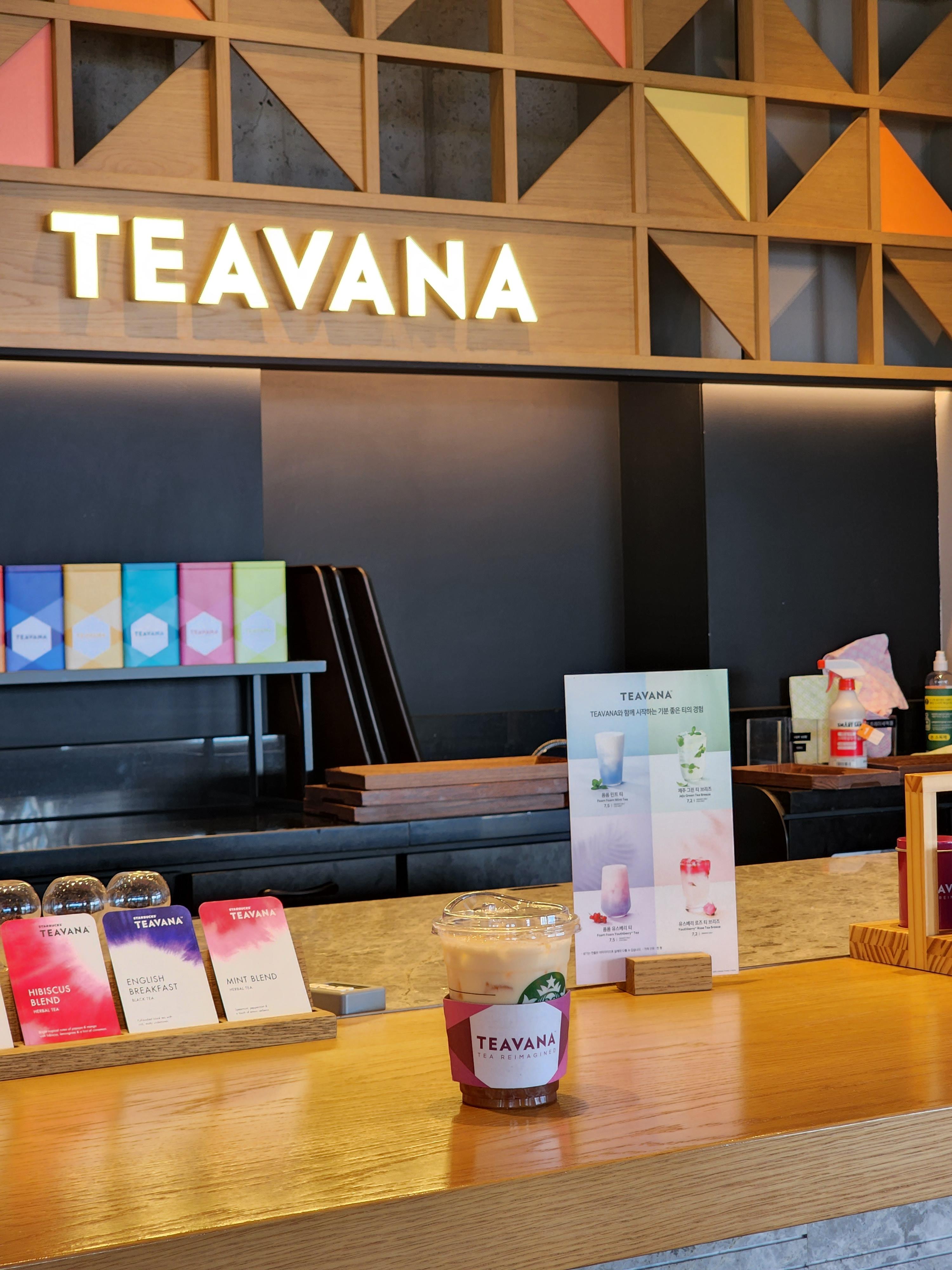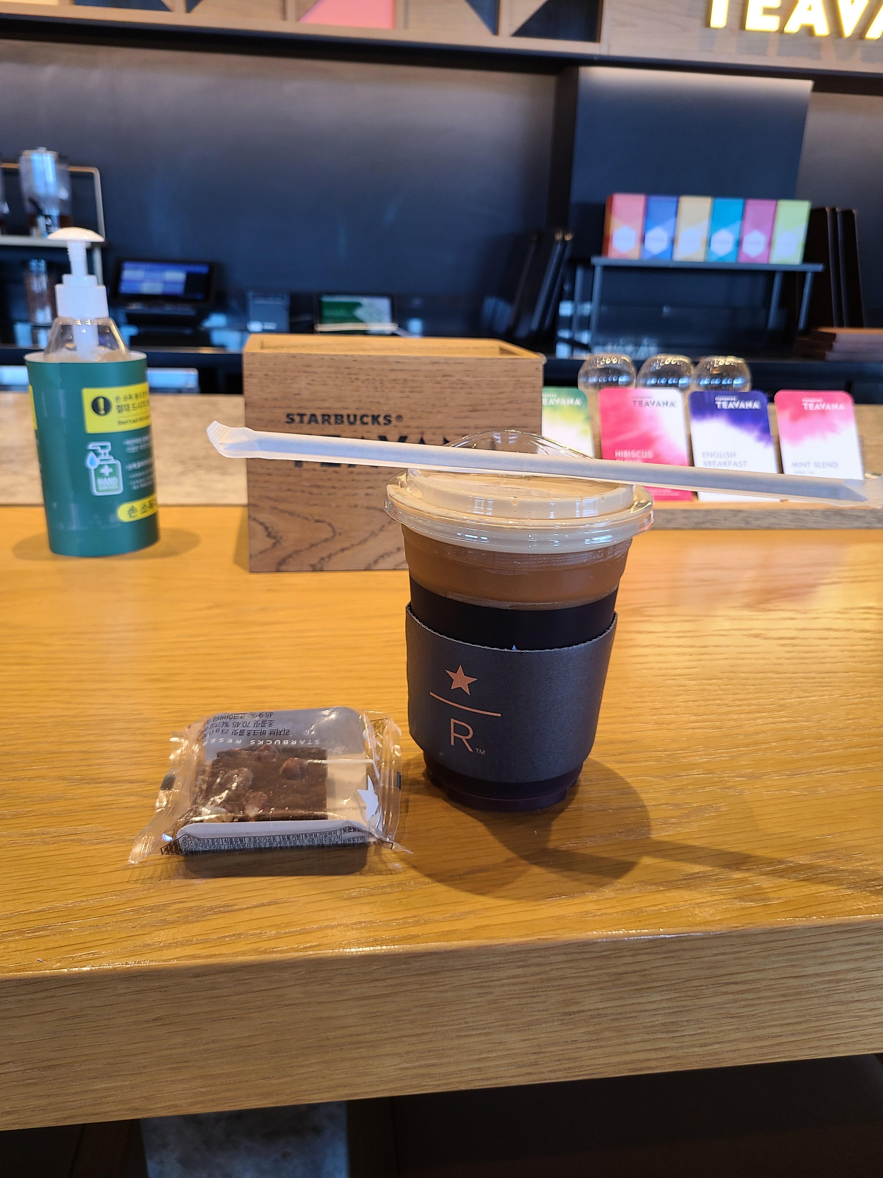 같이 출장간 동료는 아이스 어니 얼그레이 밀크티(오른쪽)를 주문했어요. 커피를 준비하는 데스크 건너편에 티바나데스크가 있는데, 고급스럽고 알록달록한 인테리어가 예뻤습니다. 음료는 꿀물에 얼그레이 티백을 우려낸듯한 달달하고 무난한 맛의 음료였습니다. 하지만 티바나라운지에서 먹으니 맛이 더욱 특별하게 느껴졌습니다. (음식은 눈으로도 먹는다고 하지요^^)