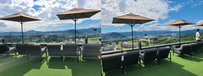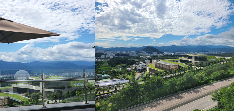 음료를 들고 2층 테라스에 잠시 들렀습니다. 날은 맑았지만 8월의 뜨거운 햇살에 사진만 찍고 얼른 내려왔습니다. 가을 하늘 같아 보여도, 아직은 한여름이네요. 뜨거웠지만 푸르른 주변과 한눈에 내려다보이는 춘천시내가 마음을 탁 트이게 해주었습니다. 오른편에는 네이버 서버실이 보입니다. 영화에 나오는 재벌집(?) 같은 분위기를 풍기고 있습니다.