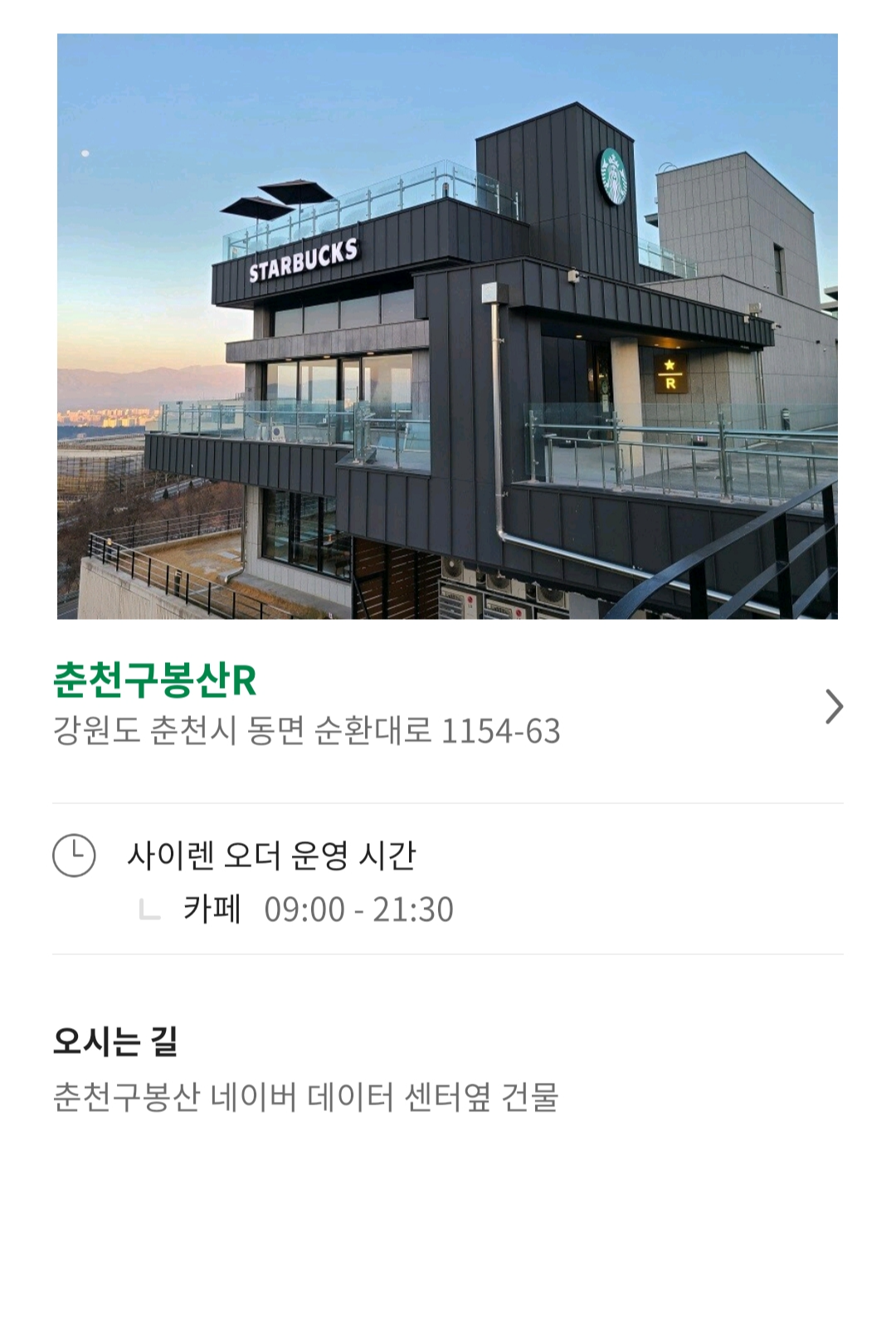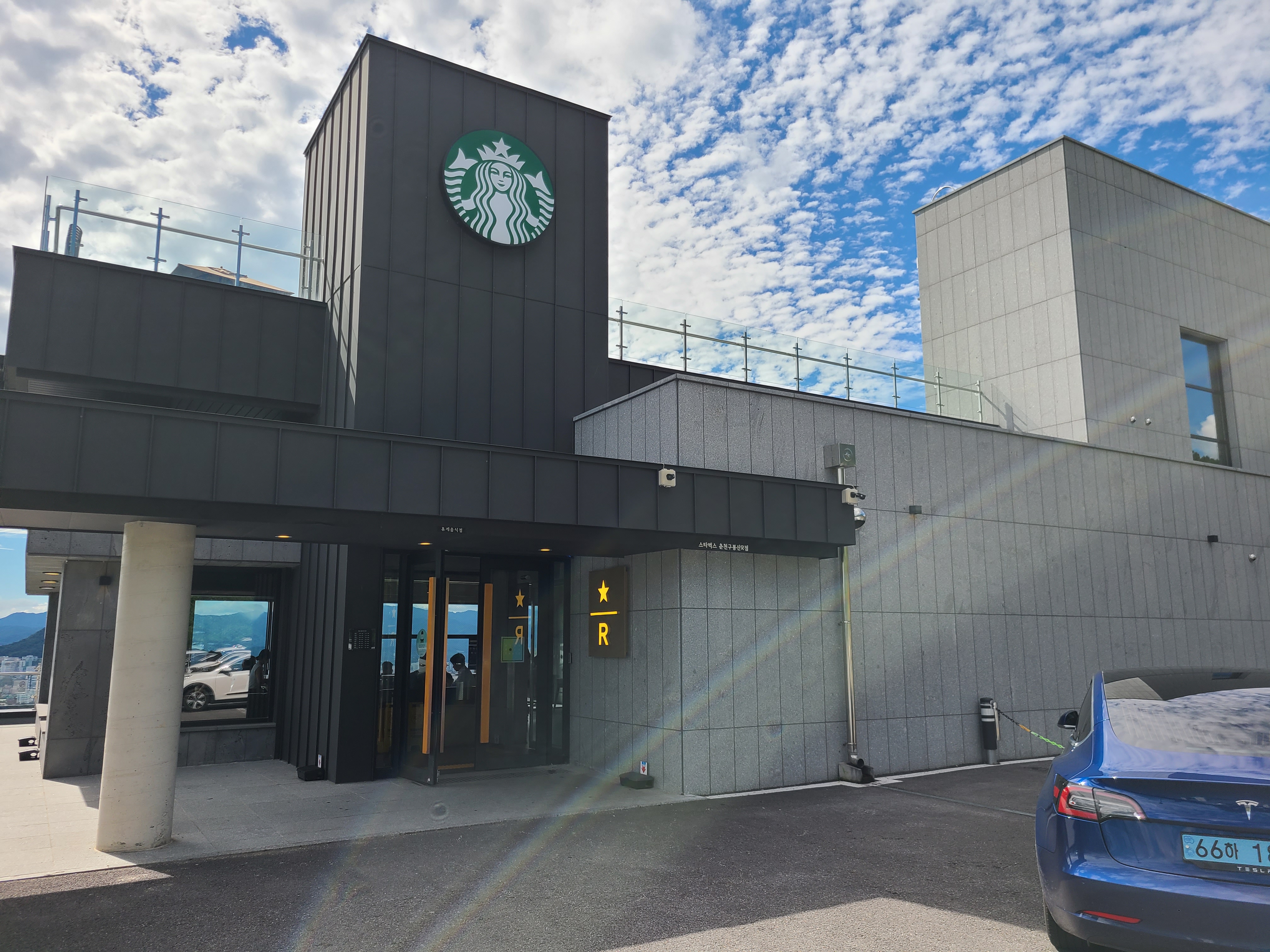 춘천에 도착해서 일을 마치고, 간만의 맑은 날씨에 그냥 가기 아쉬워서 춘천이 내려다 보이는 스타벅스 ‘춘천구봉산R’ 리저브 매장에 들렀습니다. 이곳은 춘천 현지인이 말하길, 춘천에서 전망이 가장 좋은 곳이라고 해요. 언덕 끝에 있는데 강북과 강남으로 나뉘는 춘천의 전경이 내려다 보이는 뷰를 자랑하고 있습니다. 리저브 매장 옆에는 네이버 서버실이 크게 자리 잡고 있어 신기했습니다.