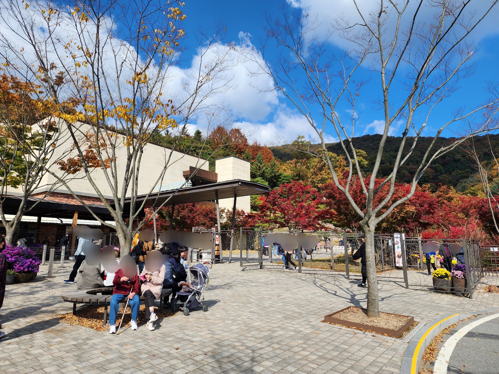 멀리서 봐도 슬로프 주차장은 차가 많긴 합니다. 다른 분들 블로그에서는 화담숲 입구에 유모차를 하차하고 슬로프 주차장으로 들어가면 된다고 하던데, 단풍철에는 운인가? 싶기도 합니다. 저처럼 유모차를 2주차장에서부터 끌고 가시는 분들도 있었고, 걸어 올라가다 보니 슬로프 주차장에서 유모차를 내리는 분들도 있었어요.