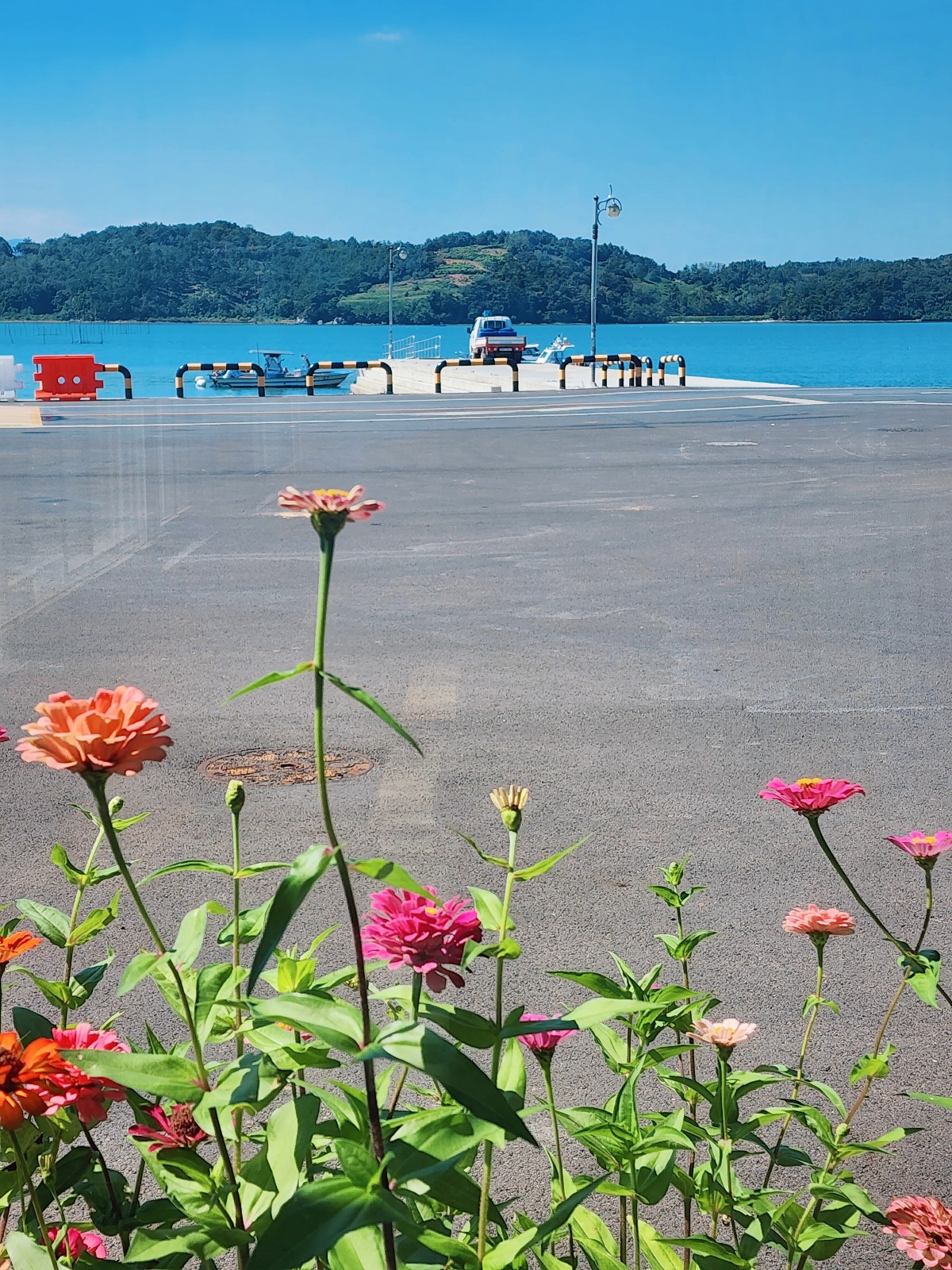 식당 내부 역시 군더더기 없이 깔끔합니다. 창문 너머 보이는 바닷가 풍경은 마치 그림 같습니다. 창문 바로 앞에는 백일홍이 심어져 있는데, 솔직히 잡초 같던 꽃이 처음으로 예뻐 보였습니다.