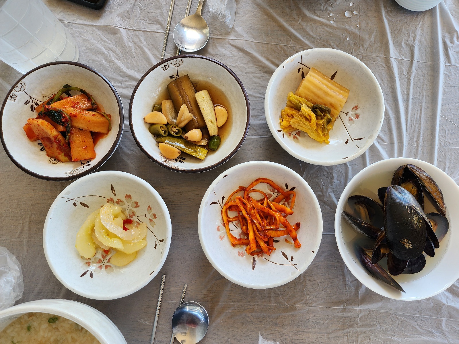 20분 정도 기다리다 보니 음식이 예쁜 그릇에 담겨 나왔습니다. 김치 및 절임류 등으로 깔끔하게 구성된 밑반찬들입니다. 담백한 맛의 백합죽과 잘 어울릴 것 같습니다. 특히 담치국이 은은하게 시원한 맛이 나서 손이 자꾸 갑니다.