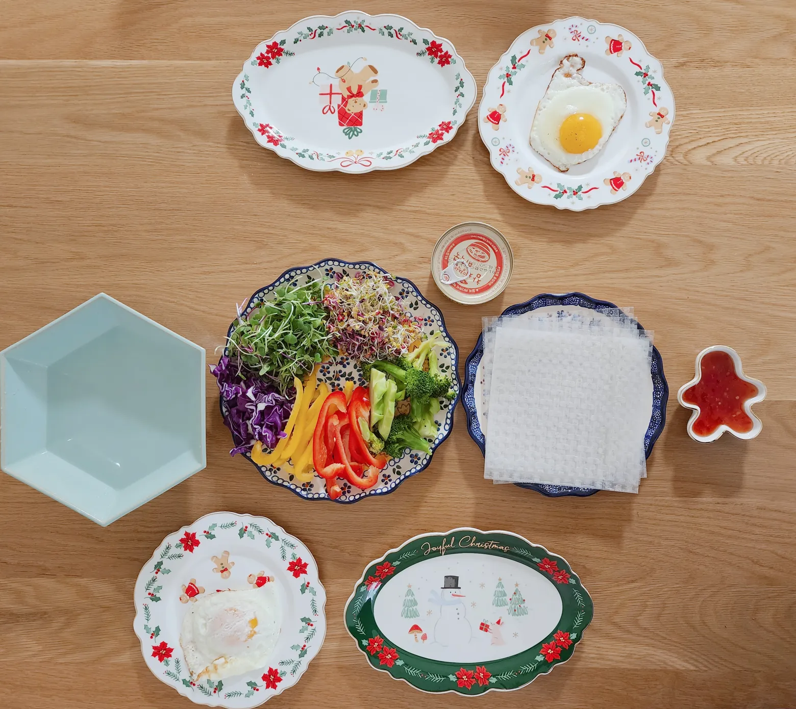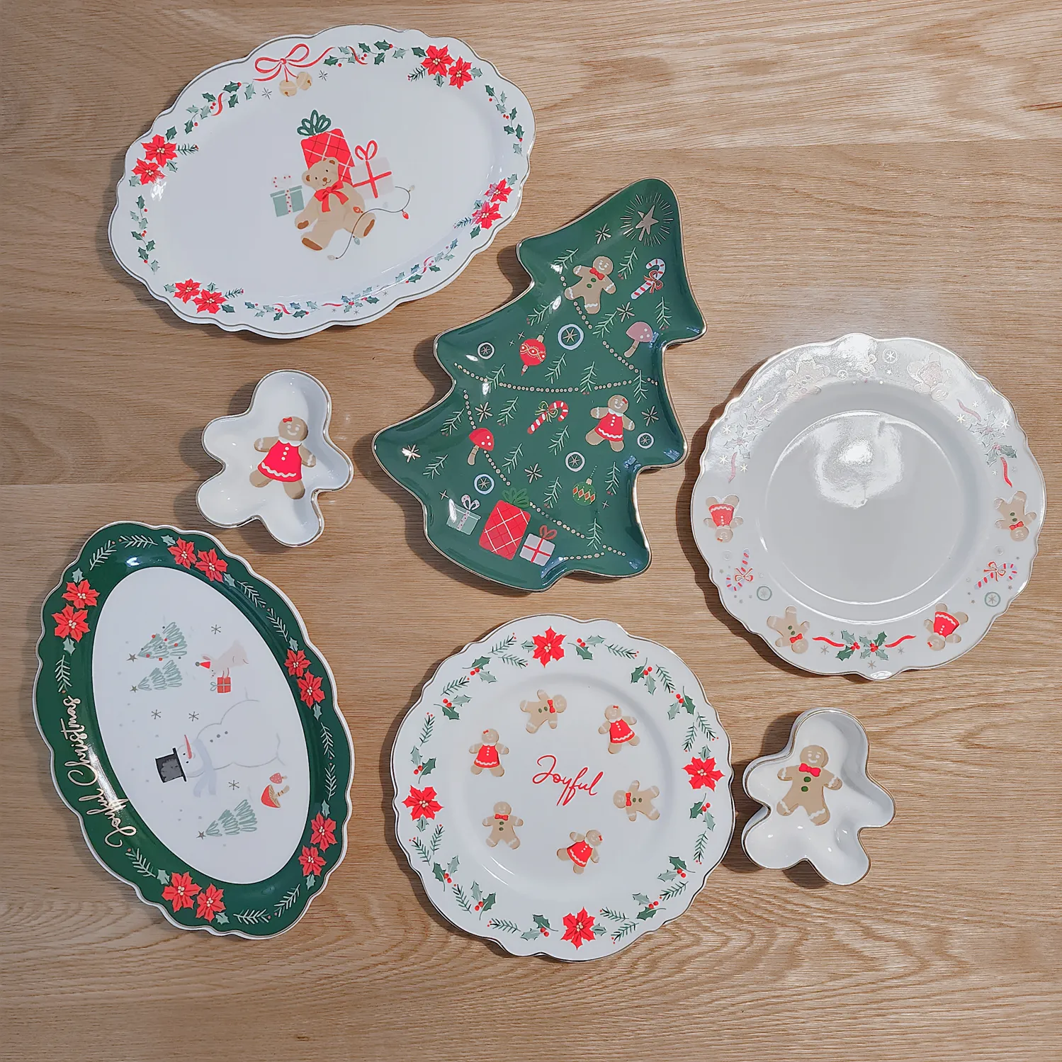 초록색 트리 모양의 그릇(윈터스토리 골드림 플레이트 그린트리)은 보자마자 꽂혀서 장바구니에 제일 먼저 넣은 제품이에요. 해당 그릇을 중심으로 어울릴 만한 다른 그릇을 골라보았습니다. 사진 속 그릇은 타원형 그릇 2개(윈터스토리 스칼럽 골드림 타원형 디너 플레이트 L25 눈사람/베어), 소스 그릇 2개(윈터스토리 골드림 미니볼 진저걸/진저 보이), 원형 그릇 2P 세트(윈터스토리 스칼럽 골드림 원형 디너 플레이트 2P 세트 D21)로, 총가격은 5만 원 조금 넘었네요.