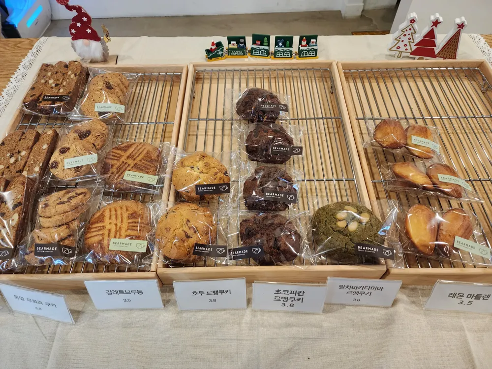 주문받는 곳 반대쪽에는 르뱅 쿠키, 마들렌이 놓여있었습니다. 가격은 3,000~4,000원 정도 하네요. 르뱅 쿠키는 뉴욕에서 유명한 르뱅 베이커리에서 만든 견과류+초코칩 쿠키라고 합니다. 겉은 바삭하고 속은 촉촉한 아메리칸 쿠키입니다.
