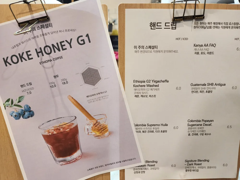 원두는 매주 매장에서 직접 로스팅 한다고 합니다. 핸드드립 커피는 7가지 종류의 원두 중에 선택할 수 있으며 6,000~6,500원에 판매되고 있습니다. 저는 이 주의 스페셜티를 선택했는데요, 이번 주는 KOKE HONEY G1이라는 에티오피아 커피였습니다.