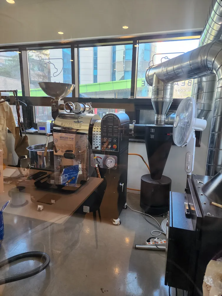 제가 마신 스페셜티 커피도 맛있었어요. 산미는 중간 정도 되는 듯하고 쓴 맛은 약했어요. 바디감 역시 중간 정도의 느낌이었고, 끝 맛이 산뜻했습니다. 제 취향에 딱 맞는 커피여서 만족했습니다. 오른쪽 사진의 로스팅 기계를 사용하여 원두를 로스팅하나 봅니다. 꽤 비싼 제품이라고 하더라고요.