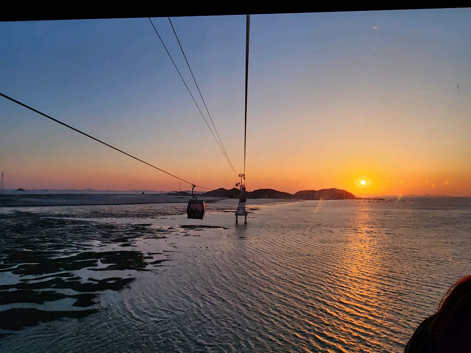 일몰 시간에 사람들이 붐빌 것 같아서 좀 더 일찍 나올 계획이었습니다만, 아기 기저귀를 갈다 보니 조금 늦어졌어요. 그래서 오히려 일몰을 볼 수 있게 되었지요. 예상과는 달리 일몰 시간에도 별로 붐비지 않았어요. 이 날의 일몰 시간은 오후 6시 27분인데 6시 정도에 탑승했습니다. 서해랑 케이블카에서 일몰을 보려면 일몰 예정 시간 20~30분 전에 타는 게 좋을 듯합니다.