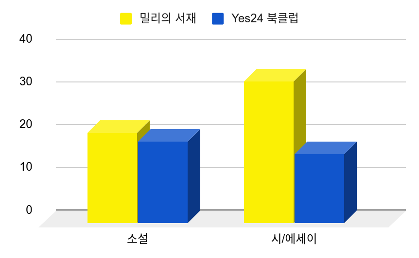 밀리의 서재 vs Yes24 북클럽 도서수 비교(소설 및 시/에세이편)
