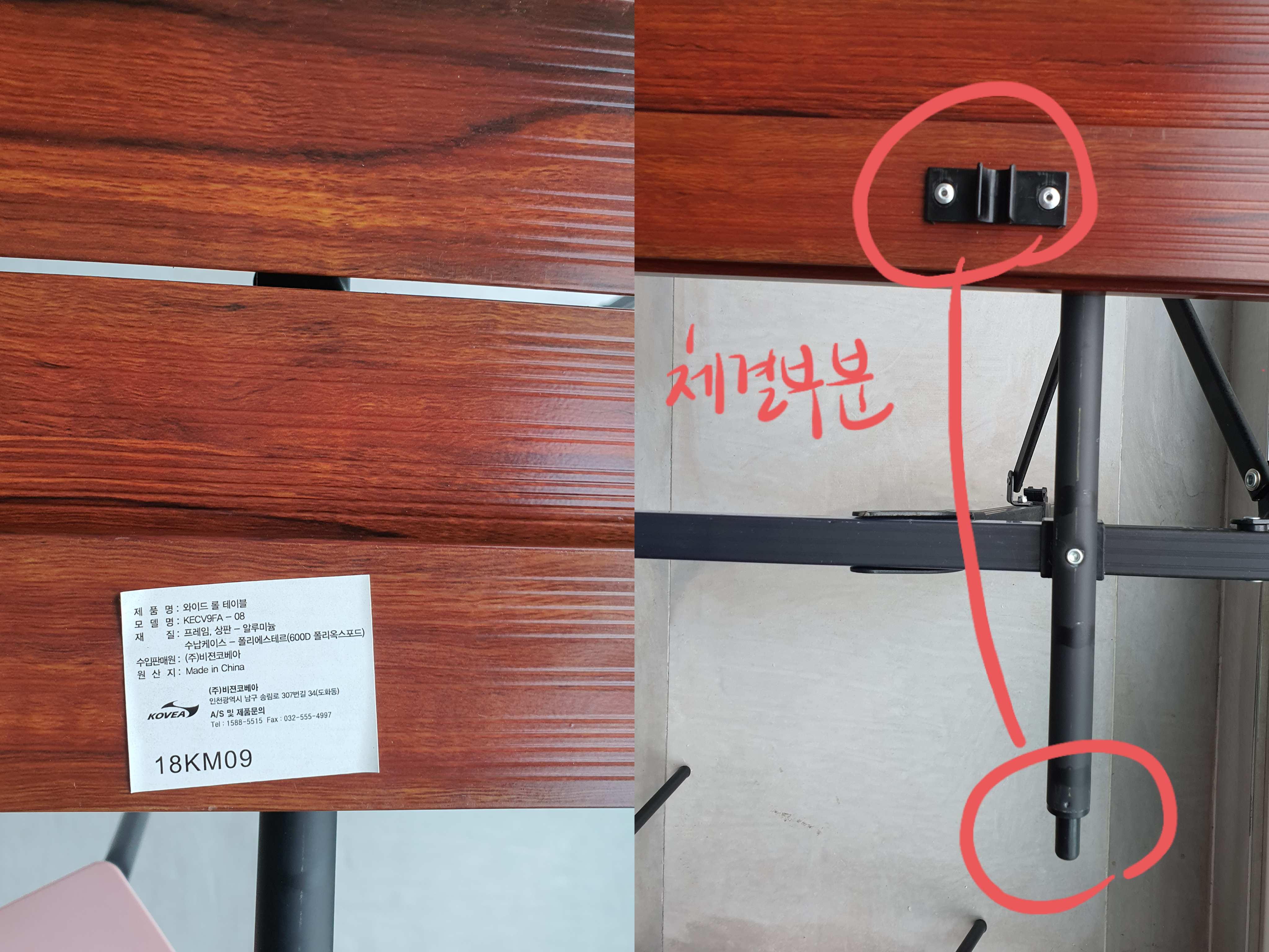 설치할 때는 다리를 먼저 펴고, 상판을 펴서 다리 위에 올려 체결해주면 끝납니다.