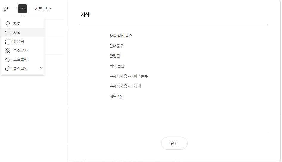 ③ 실제 글을 작성할 때에는, 에디터 상단의 · · · 을 클릭 ▶ 서식 ▶ 사용할 서식을 선택합니다.