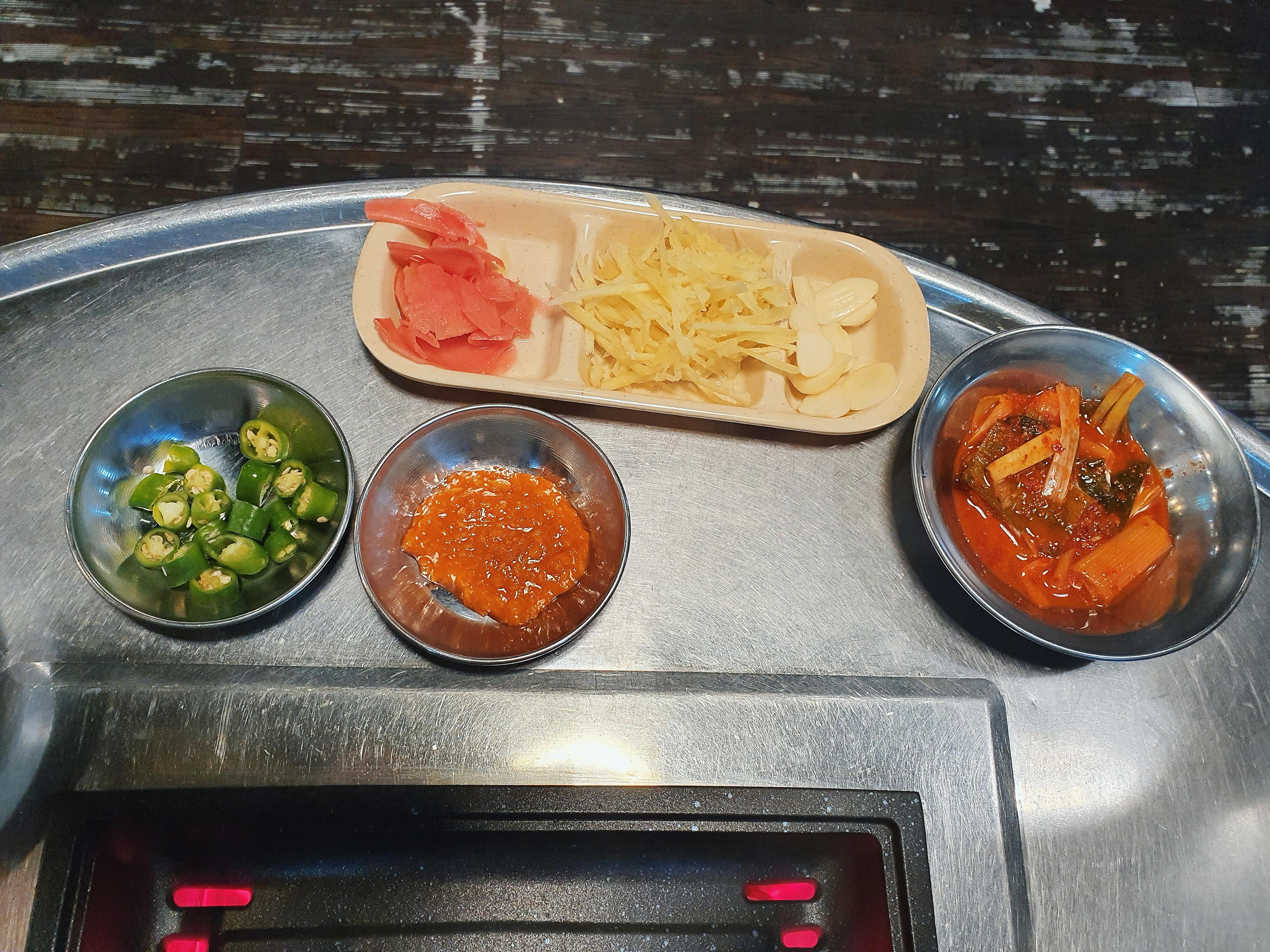 장어의 느끼함과 비린내를 잡아줄 녀석들이 등장했습니다. 생강채, 생강절임, 마늘, 고추를 같이 먹으면 확실히 장어만 먹었을 때보다 풍미가 다양해지는 것 같아요. 특히 생강과 장어는 궁합이 잘 맞는 음식이라고 하네요.