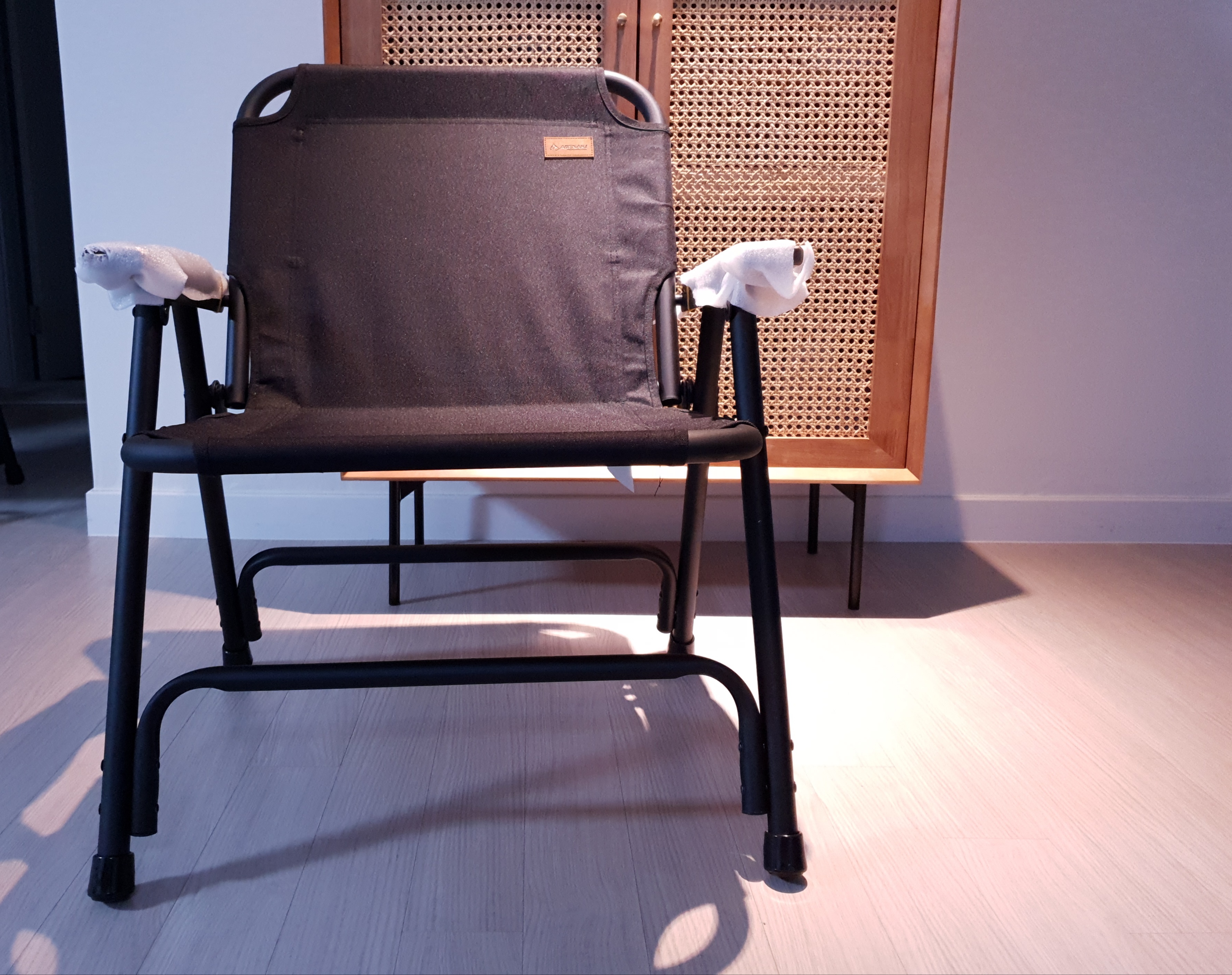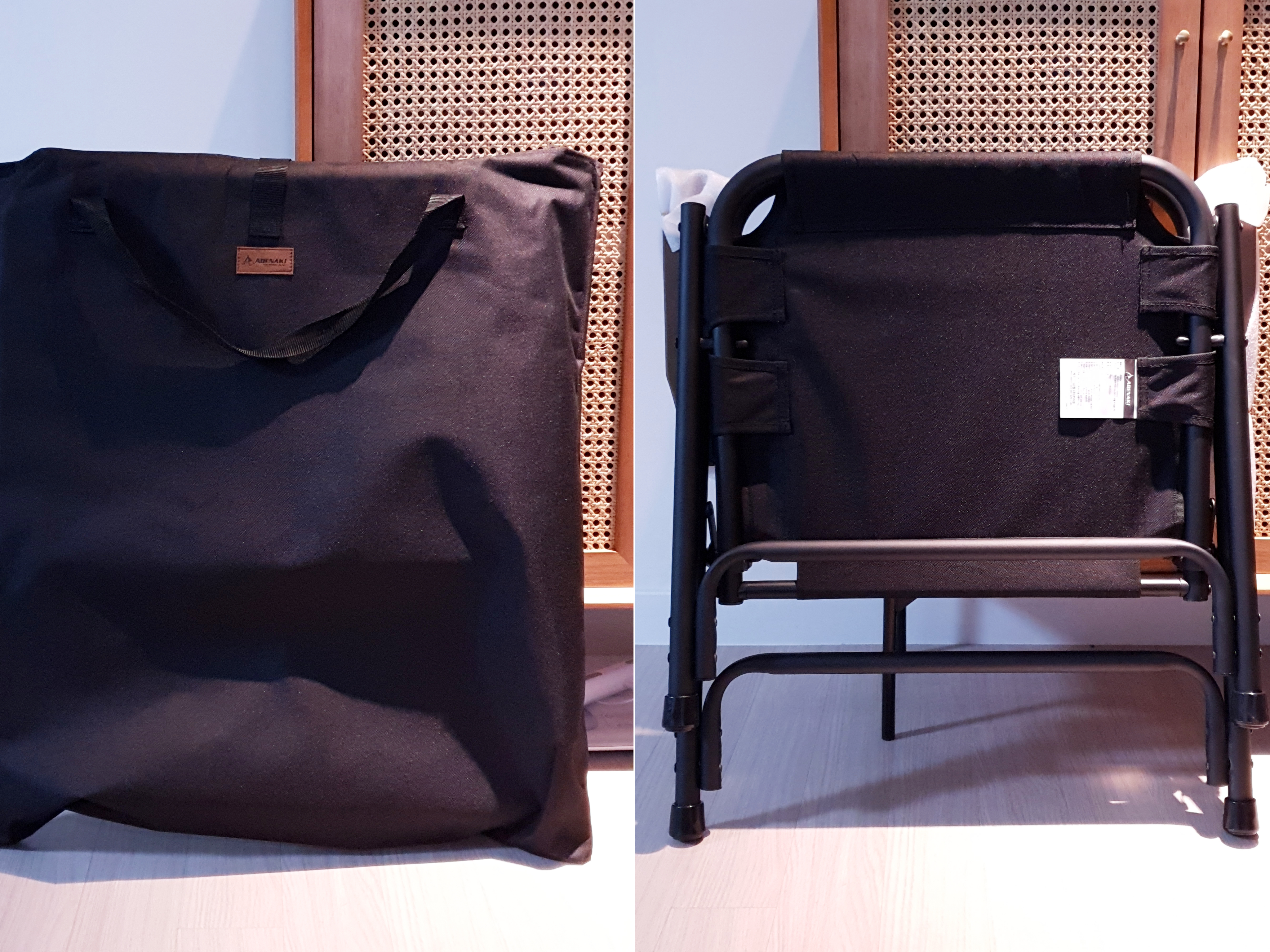 아베나키 솔리드 플랫체어는 접었을 때 사이즈가 55X7.5X61으로 부피가 작지 않습니다. 그래서 아베나키 어셈블 체어와 고민을 했는데, 조립해서 쓸 바에는 이미 갖고 있는 헬리녹스 체어홈 의자를 들고 나갈 것 같았어요. 부피가 좀 크더라도 편하게 쓰고 싶었고, 튼튼하고 안정적인 의자였으면 했어요. 더불어 파우치도 함께 줘서, 의자를 깔끔하게 보관할 수 있습니다.