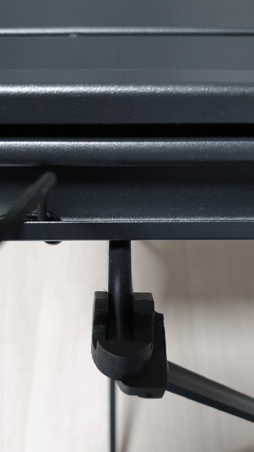 롤테이블은 펴서, 다리 폴딩 상단부 홈에 맞춰 끼워주면 끝납니다. 사진에 보이는 고무줄은 롤테이블 접고나서 펴지지 않도록 고정하는 역할을 합니다.