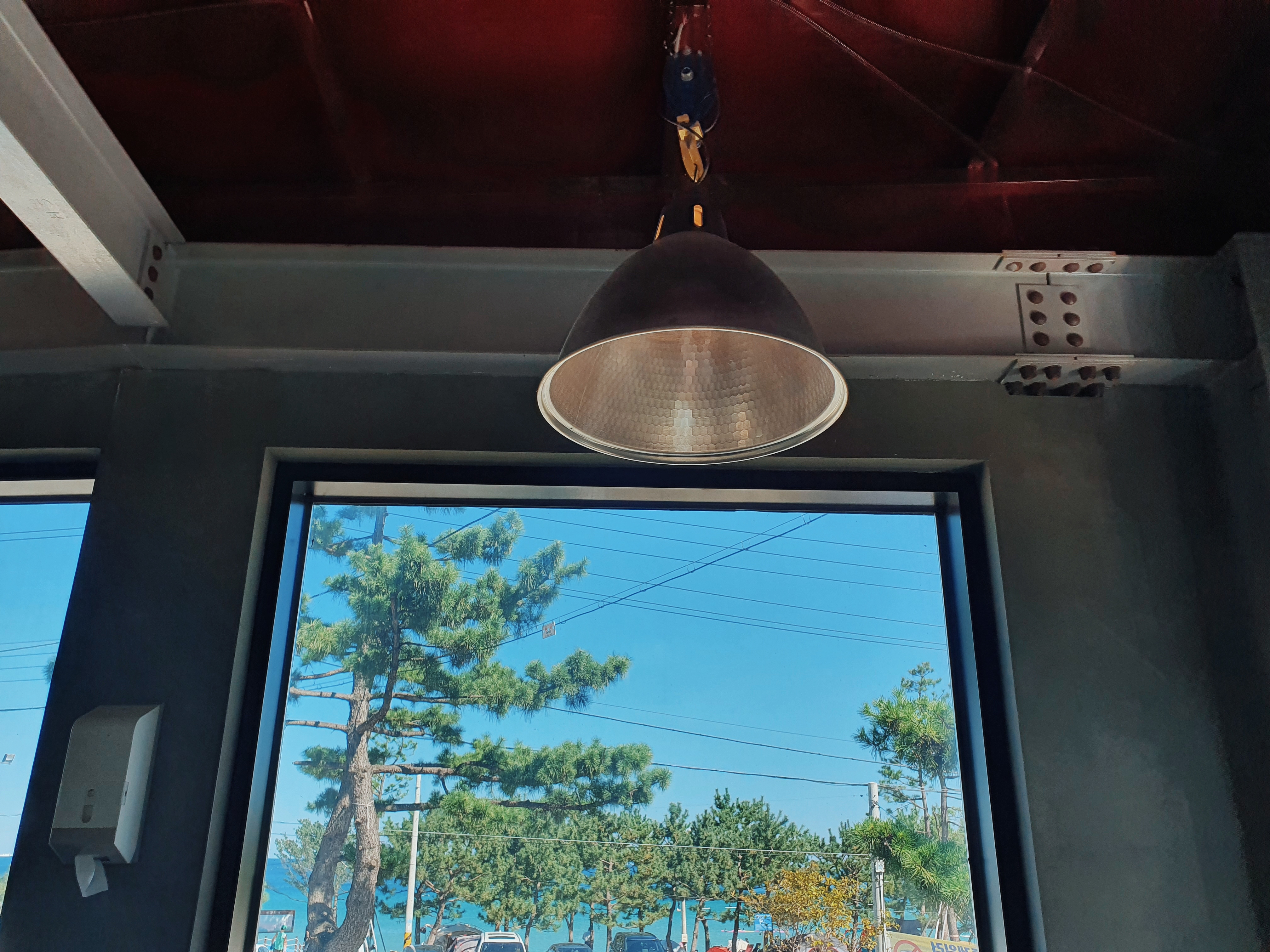 1층에서 주문을 하고 2층에 올라가서 자리를 잡았습니다. 컨테이너 하우스로 만들어진 가게의 내부는 인더스트리얼 스타일로 꾸며져 있었어요. 사장님이 센스가 넘치는 분이 아닐까 싶네요. 특히 조명이 멋져서 한 컷 찍어보았습니다.