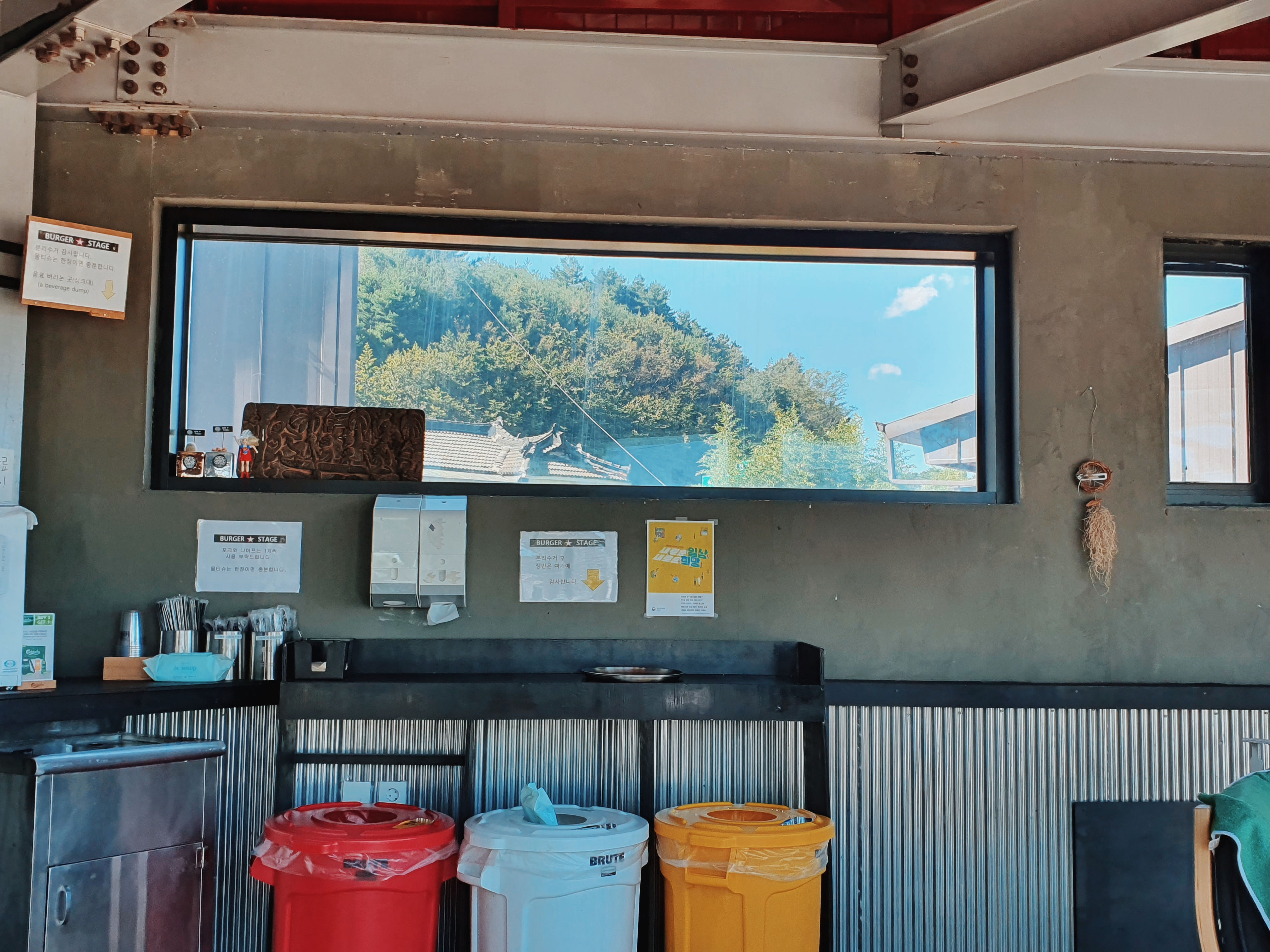창 너머로 보이는 푸르른 산에도 눈길이 가고, 원색의 쨍한 쓰레기통도 예쁩니다. 플라스틱 포크와 나이프, 물티슈와 휴지 등도 준비되어 있습니다.